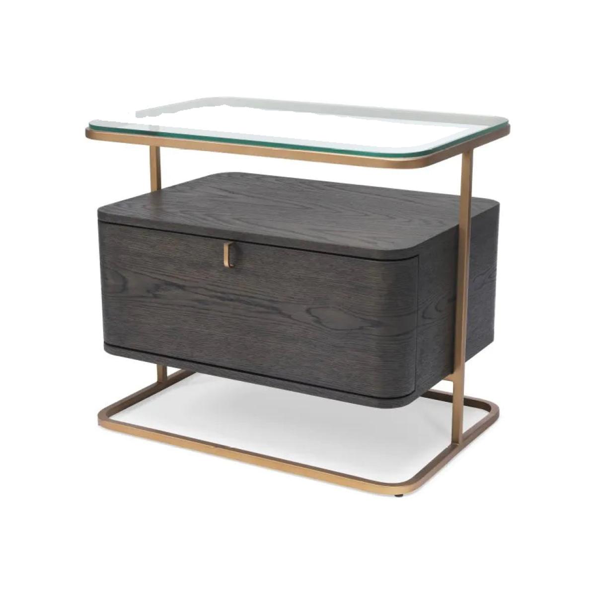 With its seductive curves and vintage look, the 1-drawer Augusto Side Table is a must-have nightstand in your bedroom. The mocha crown oak veneer case and clear glass tabletop perfectly complements the sleek metal frame with brushed brass finish. Finish/Colour: Brown