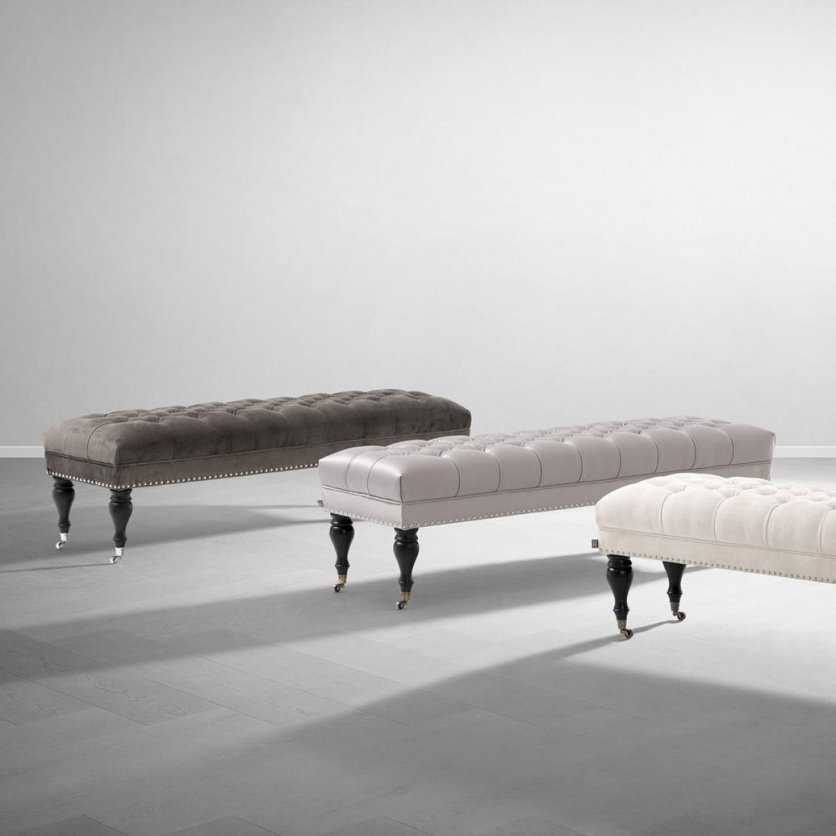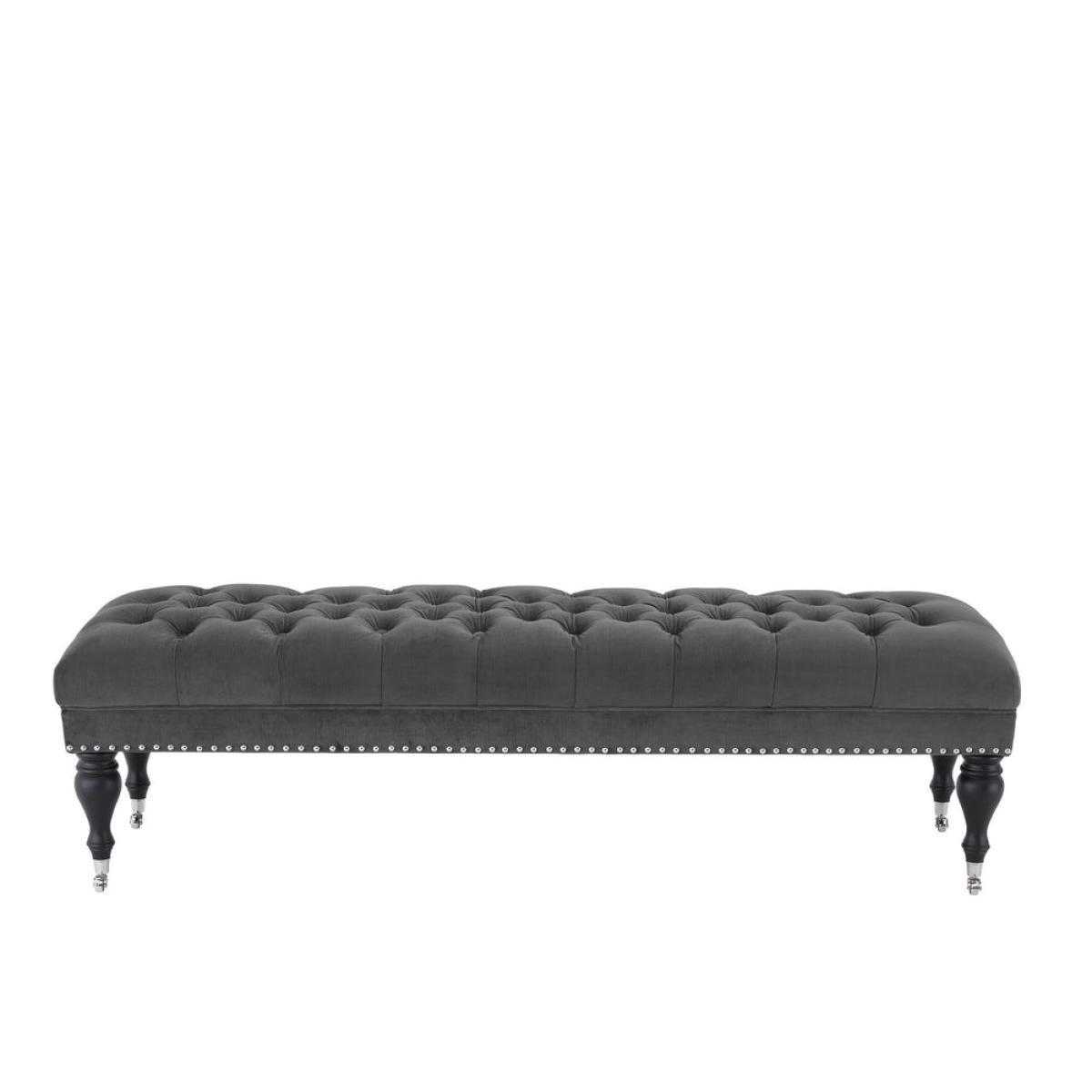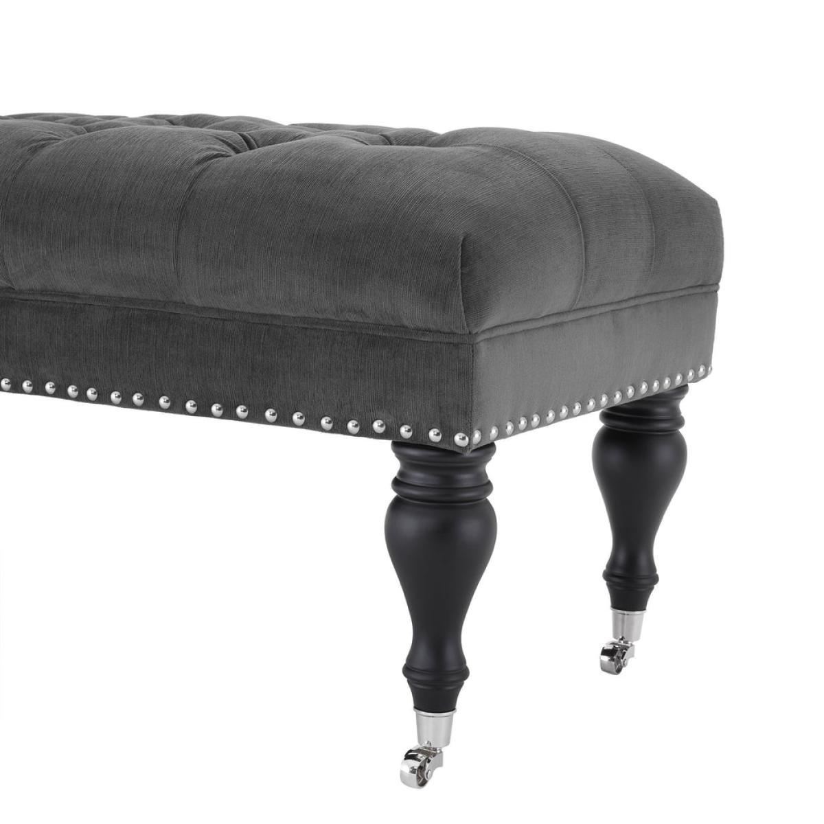Grace your home interior with the timeless beauty of the Benedict Bench. Featuring a deep buttoned upholstery that breathes the classic chic of Chesterfields, nickel studs, beautiful turned legs and nickel castor wheels, this granite grey satin ottoman elevates your classic décor. Downloads:. Item specification sheet. Finish: Granite grey | black legs | nickel hardware. *Moot Trading Ltd is not a lender and acts only as an introducer. The credit product is provided by Klarna Bank AB (publ). Credit is only available to permanent UK residents aged 18 and over, subject to status. Terms and conditions apply. Please note that the following products are not regulated by the FCA: Pay in 30 days and Pay in 3 instalments. Read More.