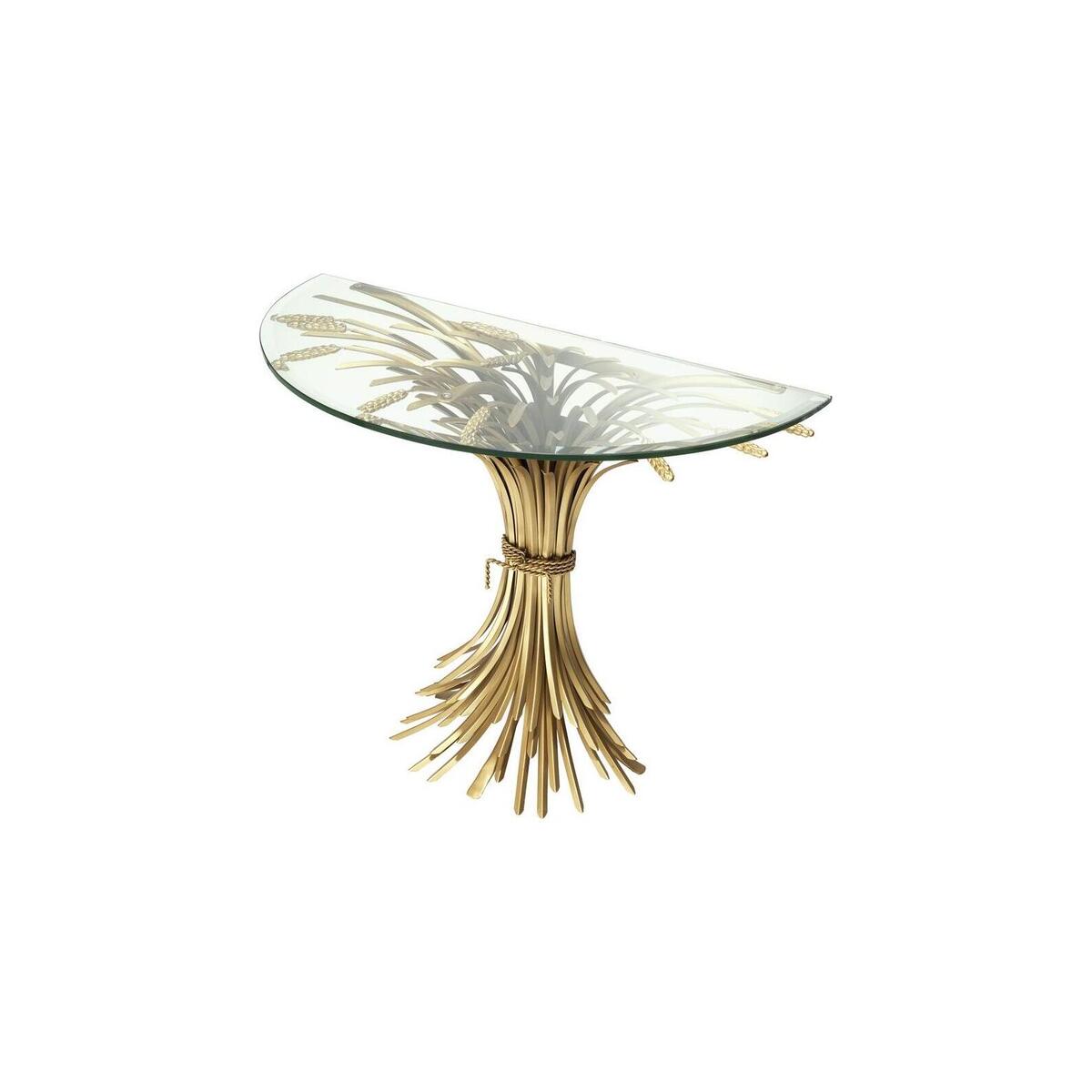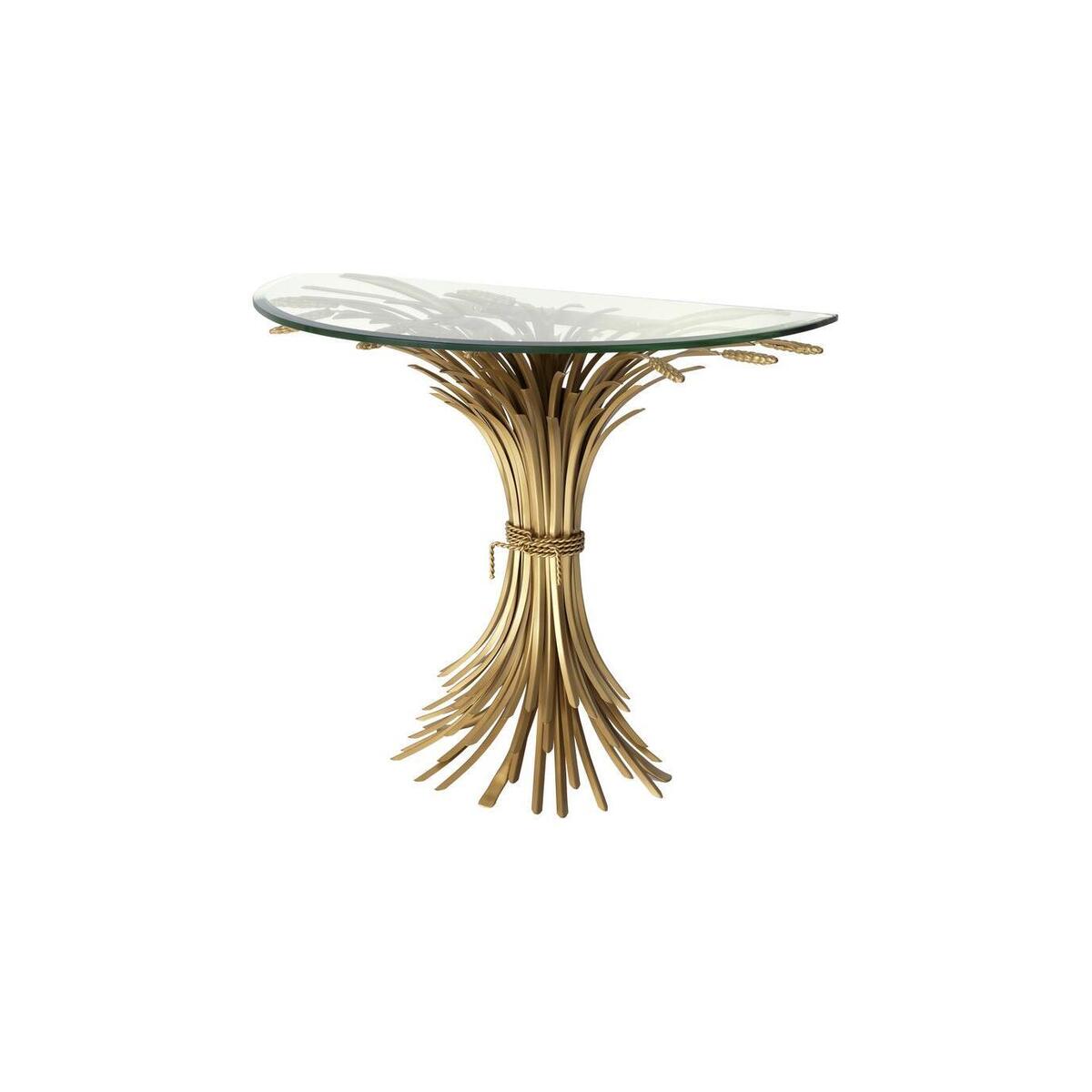 Sculpted from iron in an antique gold finish, the dazzling Bonheur Console Table includes a sheaf-shaped base and a bevelled clear glass tabletop. Originally a symbol of prosperity and hospitality, the sheaf signifies one has worked hard and is now enjoying the good life. Downloads:. Item specification sheet. Finish: Antique gold finish | bevelled clear glass. *Moot Trading Ltd is not a lender and acts only as an introducer. The credit product is provided by Klarna Bank AB (publ). Credit is only available to permanent UK residents aged 18 and over, subject to status. Terms and conditions apply. Please note that the following products are not regulated by the FCA: Pay in 30 days and Pay in 3 instalments. Read More.