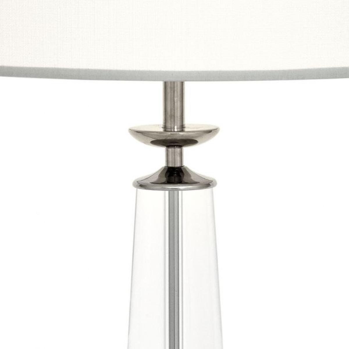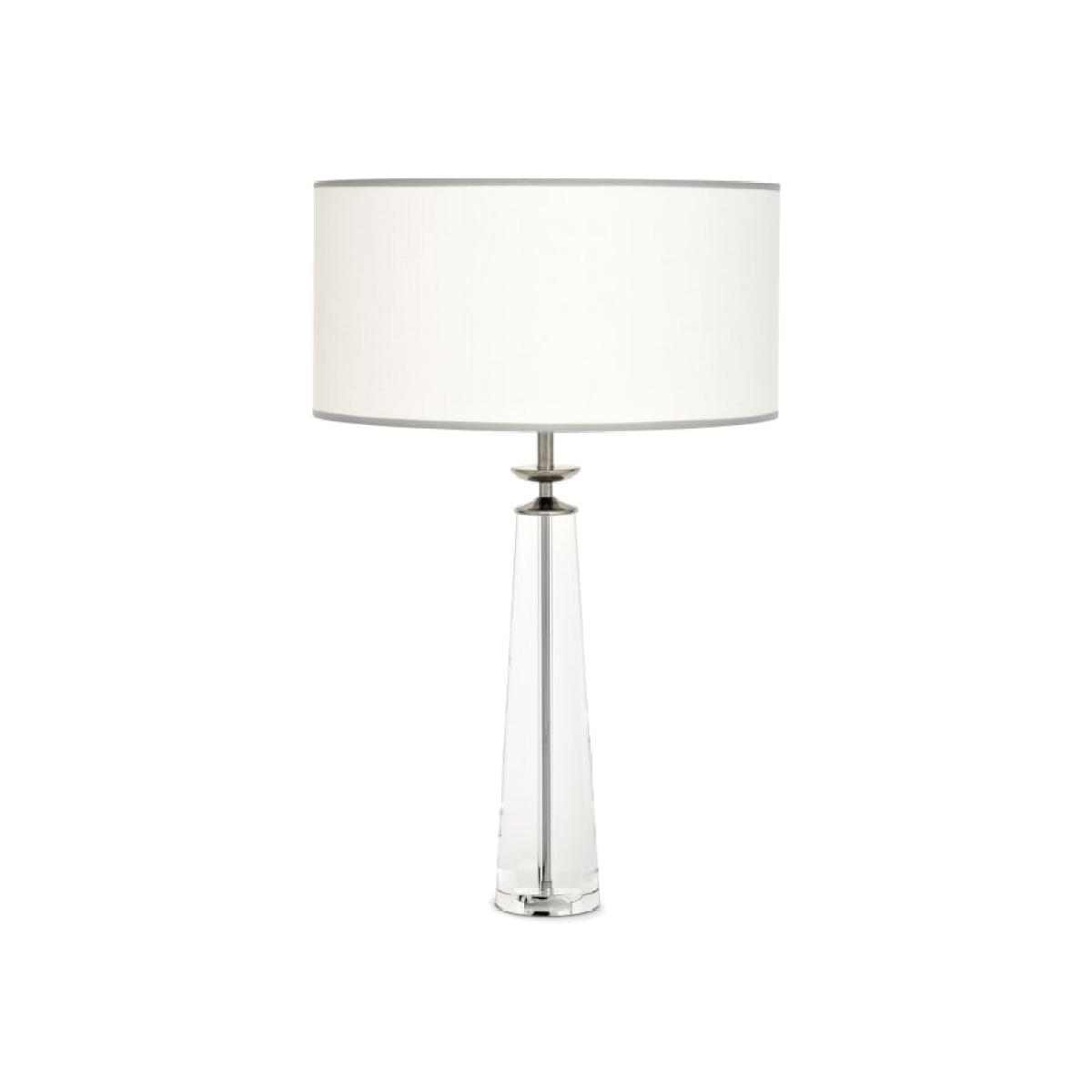Illuminate the beauty of your interior with the Chaumon Table Lamp. Perfect for both traditional and contemporary interiors, its tapered crystal glass exterior and visible nickel rod base creates a lovely mix of materials. This elegant fixture comes with an off-white lampshade with grey trim. Dimensions: A. Base Width 12 cm | B.  Shade Width 50 cm | C. Height 80 cm