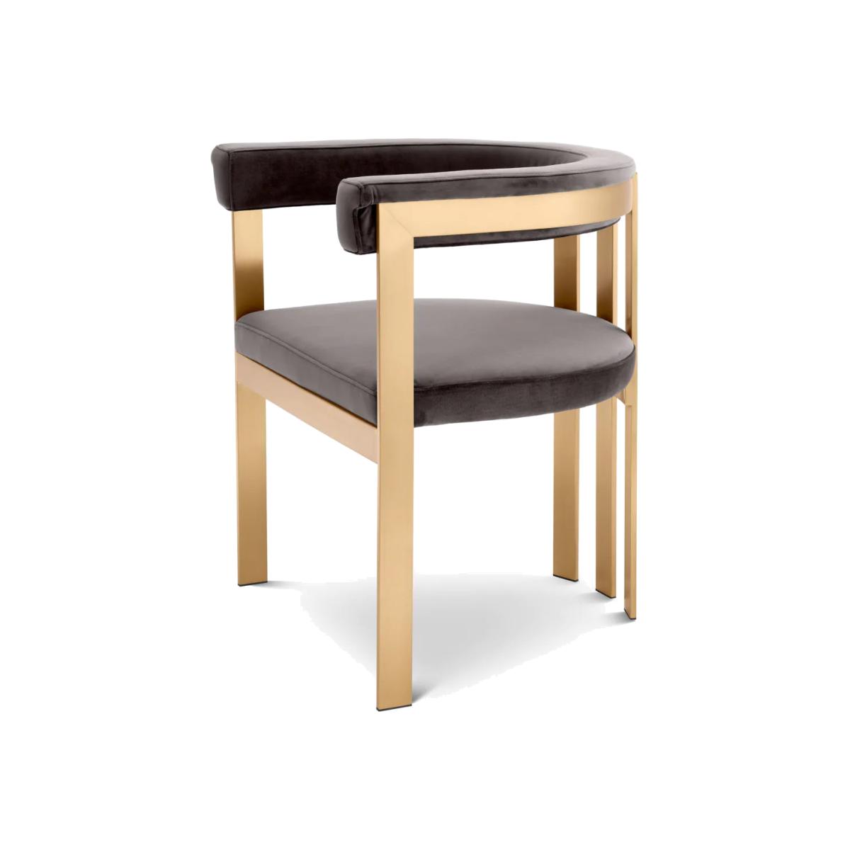 Decorate your dining area in contemporary style with the Clubhouse Dining Chair. This ultra-chic chair features a stylish frame in a brushed brass finish with a backrest that blends seamlessly into the armrests. The comfortable seat and backrest are upholstered in Savona grey velvet, and allow your guests to enjoy seating for long periods at a time.