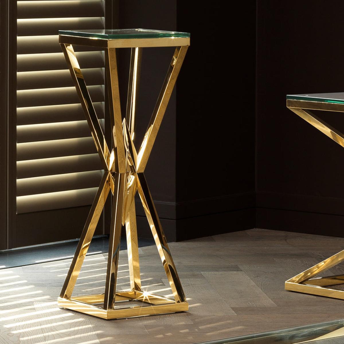 Discover the versatility of the Connor Column. With its shiny pyramid base, this designer table adds radiance and splendour to your home décor. Crafted from stainless steel, the conspicuous geometric base features a glamorous gold finish and a clear glass top. Downloads:. Item specification sheet. Assembly instruction. Finish: Gold finish | clear glass. *Moot Trading Ltd is not a lender and acts only as an introducer. The credit product is provided by Klarna Bank AB (publ). Credit is only available to permanent UK residents aged 18 and over, subject to status. Terms and conditions apply. Please note that the following products are not regulated by the FCA: Pay in 30 days and Pay in 3 instalments. Read More.