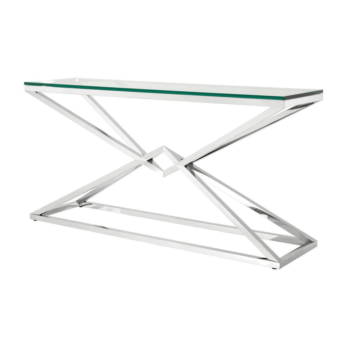 Discover the versatility of the Connor Console Table. With its shiny pyramid base, this designer table adds radiance and splendour to your home décor. Crafted from stainless steel, the conspicuous geometric base features a polished finish and a clear glass tabletop. Downloads:. Item specification sheet. Assembly instruction. Finish: Polished stainless steel | clear glass. *Moot Trading Ltd is not a lender and acts only as an introducer. The credit product is provided by Klarna Bank AB (publ). Credit is only available to permanent UK residents aged 18 and over, subject to status. Terms and conditions apply. Please note that the following products are not regulated by the FCA: Pay in 30 days and Pay in 3 instalments. Read More.