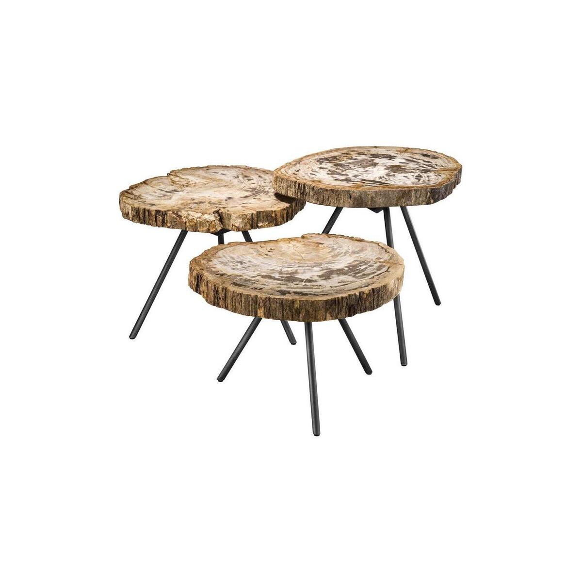 Grains, knots and holes grant a unique appearance to the. Coffee Table. De Soto set of 3 with petrified wood table tops. Characterised by natural brown, grey and white tones, these distinctive coffee tables are suitable for a variety of interior styles and colour schemes. The tables vary in height and feature bronze finish legs. Petrified wood literally means: wood turned into stone. Trees that have been buried under sediment for many years can transform into stone. While retaining the original structure of the stem tissue, all the organic materials are replaced with minerals. Downloads:. Item specification sheet. Finish: Light range petrified wood | gunmetal legs. *Moot Trading Ltd is not a lender and acts only as an introducer. The credit product is provided by Klarna Bank AB (publ). Credit is only available to permanent UK residents aged 18 and over, subject to status. Terms and conditions apply. Please note that the following products are not regulated by the FCA: Pay in 30 days and Pay in 3 instalments. Read More.