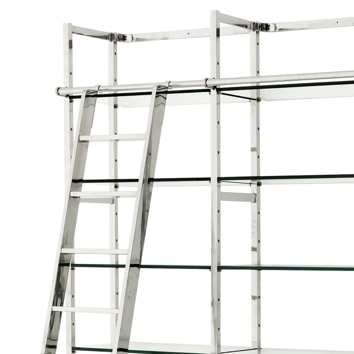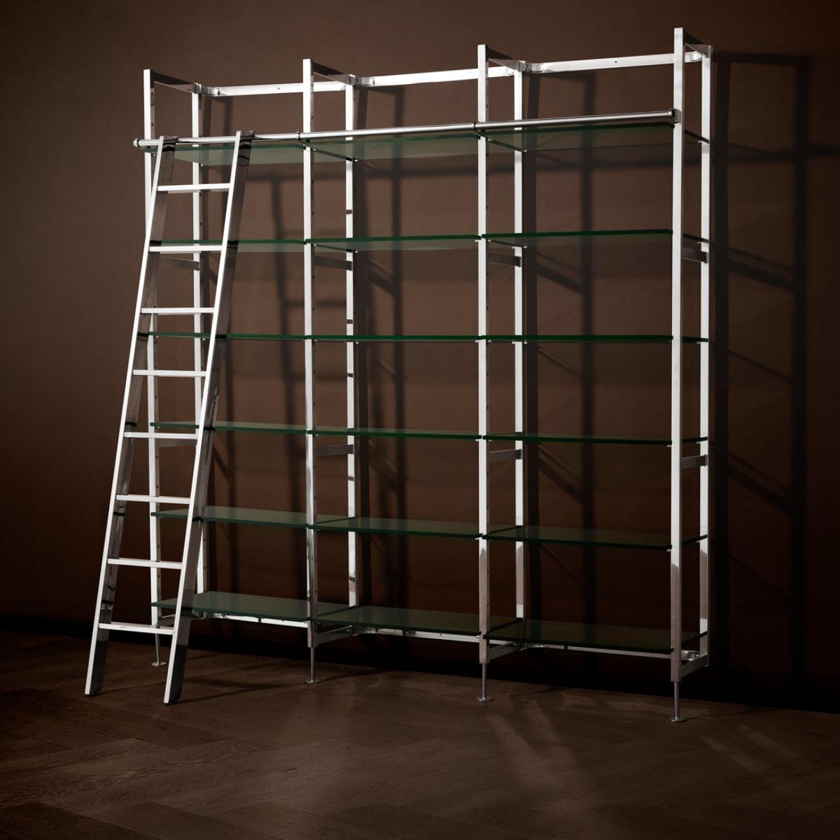 Immerse your lounge, study or home library in luxuriance with the opulent Delano Cabinet. Featuring three sections with 6 thick clear glass shelves (18 shelves in total), marvellous wall unit of polished stainless steel will be right at home in your modern décor. All shelves have 3 options in terms of height. They can be mounted parallel or uneven. This cabinet comes with a ladder that can be hooked on the horizontal rod. Downloads: Item specification sheet Assembly instruction Dimensions: W:225 x D:51 x H:238 cm. Weight: 140 kg Finish: Polished stainless steel | clear glass