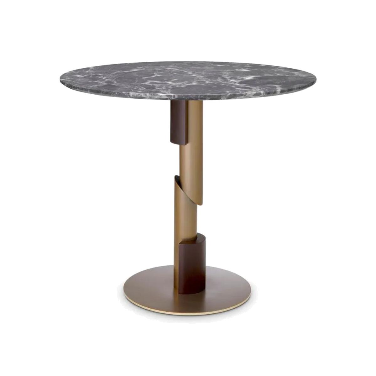 A true showstopper, Dining Table Flow features a sculptural design that combines different materials and finishes to create a masterpiece. The grey marble tabletop is mounted on a free-shaped brushed brass pole with brown veneer accents that stands on a round brushed brass finish base. Sleek and stylish, this beautiful dining table works everywhere. Dimensions: Ø 85 | H. 76 cm Materials: Brushed brass finish | grey marble | brown veneer Marble is a natural material, each piece differs in color and veining Assembly Required: Yes Care Instructions:Wipe with a clean, damp cloth. Dry with a clean, soft cloth. No harsh abrasives or cleaners