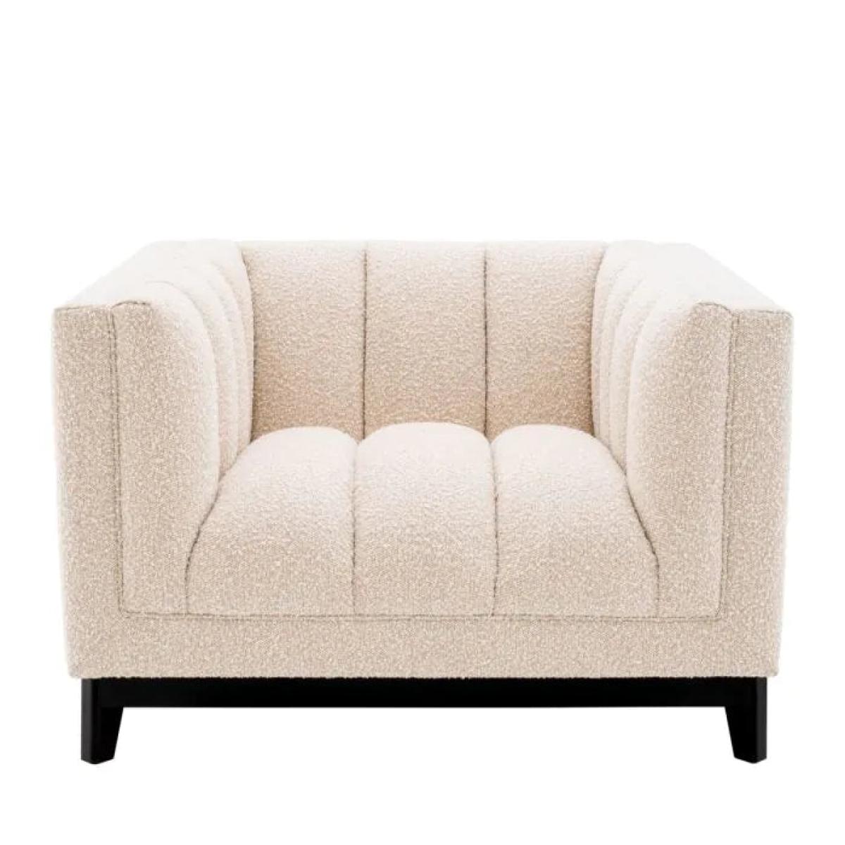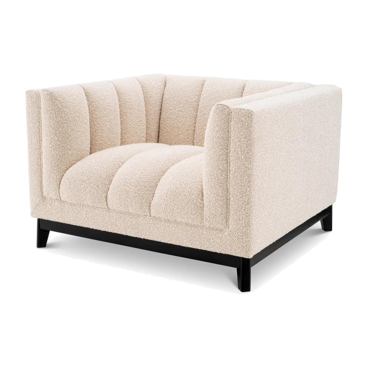 Resting upon a black finish base and upholstered in cream-coloured bouclé, Chair Ditmar will bring lots of charm and warmth to your living room. The deep channel stitching of the seat and backrest gives this contemporary armchair a touch of nostalgia. Finish/Colour: Cream, beige