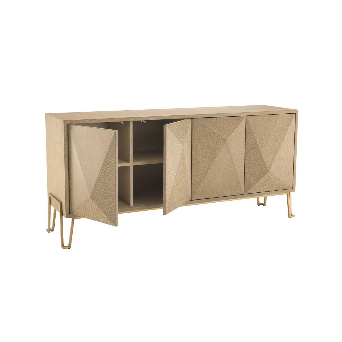I really like this dresser for its sleek, modern design with a touch of Art Deco flair, thanks to the faceted front panels. It works particularly well in contemporary or minimalist interiors where it can serve as a statement piece, but it’s also versatile enough to complement more neutral, Scandinavian-inspired spaces. Practical styling tips include keeping accessories simple-think a statement lamp or decorative objects on top-since the geometric doors already add visual interest. Its neutral oak finish makes it adaptable for mixing with various colour palettes, whether warm earthy tones or cooler hues, making it a flexible addition to both living rooms and dining areas. The ample storage and clean lines make it as functional as it is stylish, perfect for adding a touch of sophistication without clutter.