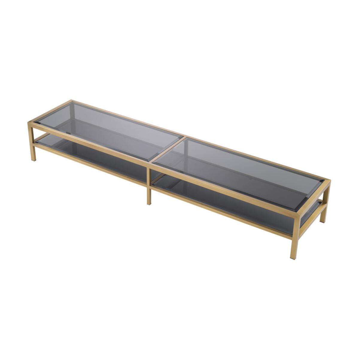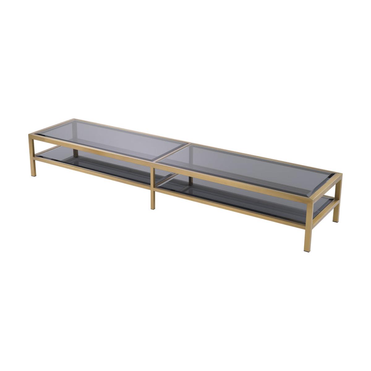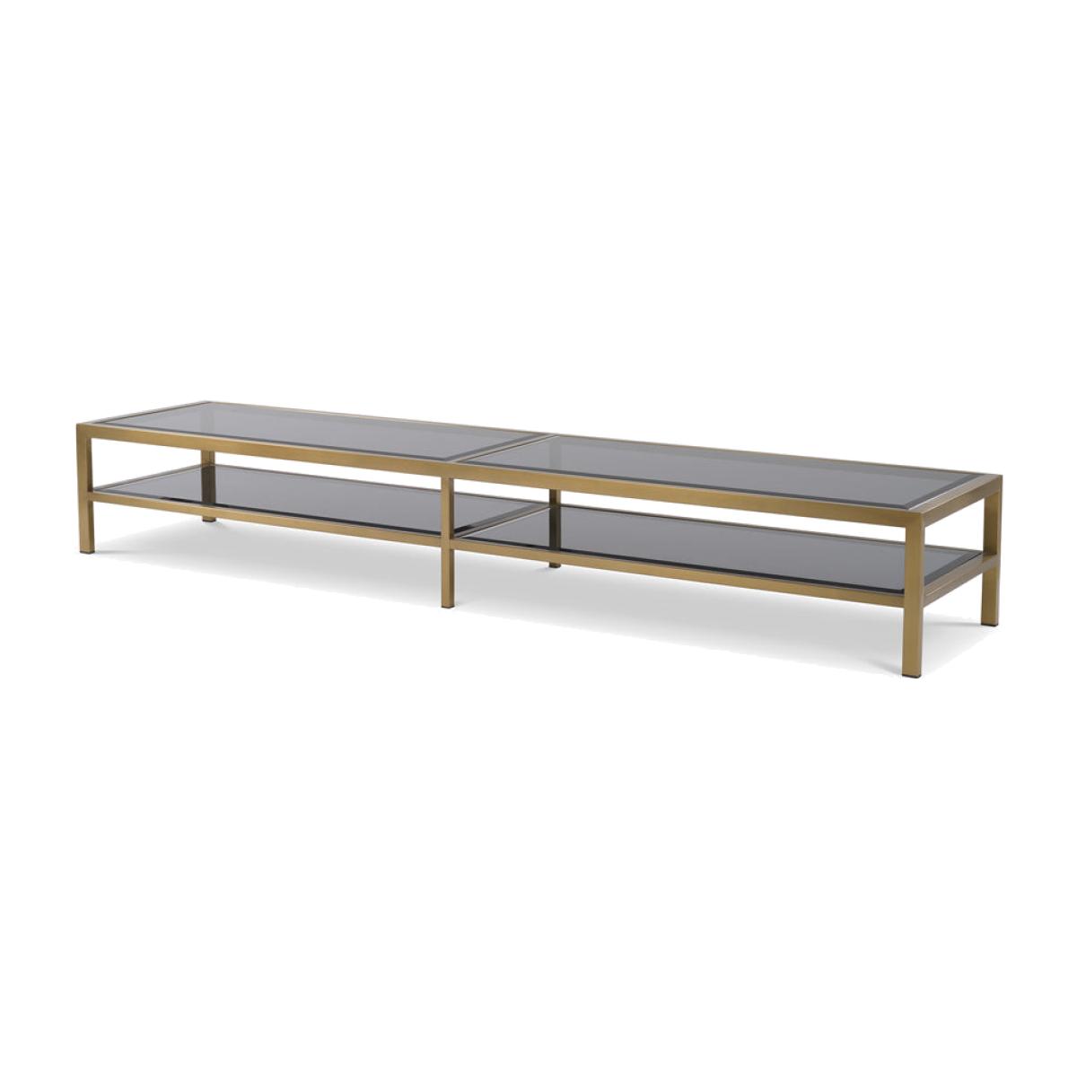 A strong linear profile sets TV Cabinet Duel apart. Its brushed brass finish frame offset the two tiers of smoked glass, creating an artful backdrop for your media collection, electronic devices an. View More. A strong linear profile sets TV Cabinet Duel apart. Its brushed brass finish frame offset the two tiers of smoked glass, creating an artful backdrop for your media collection, electronic devices and decorative items.