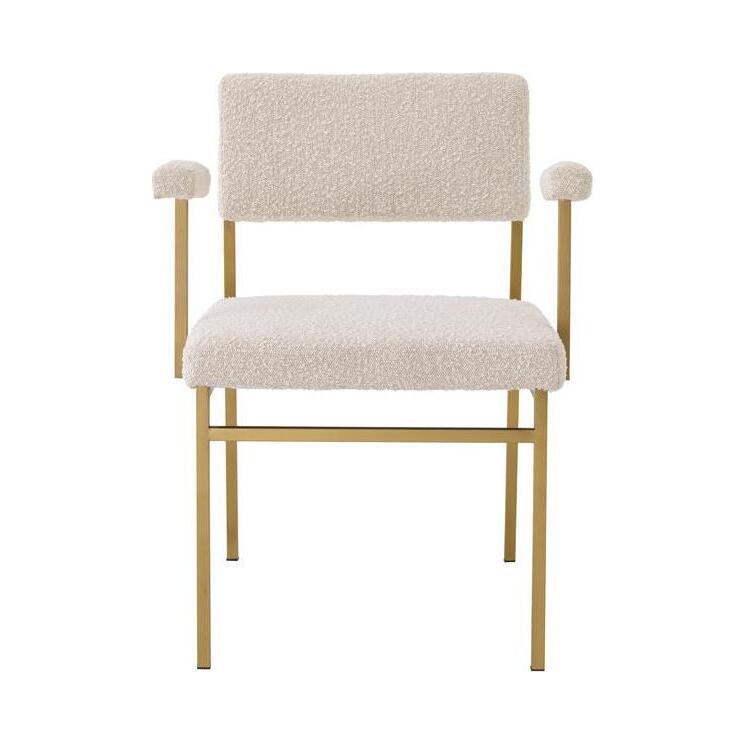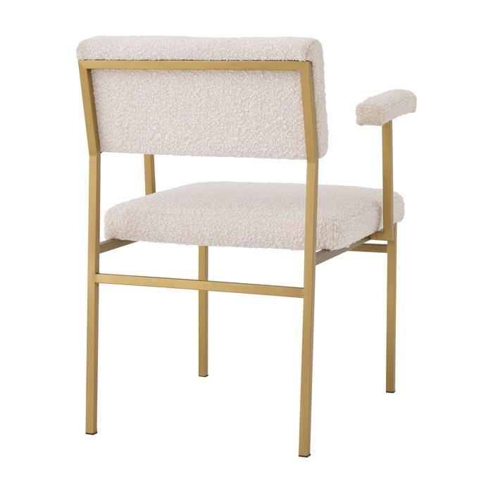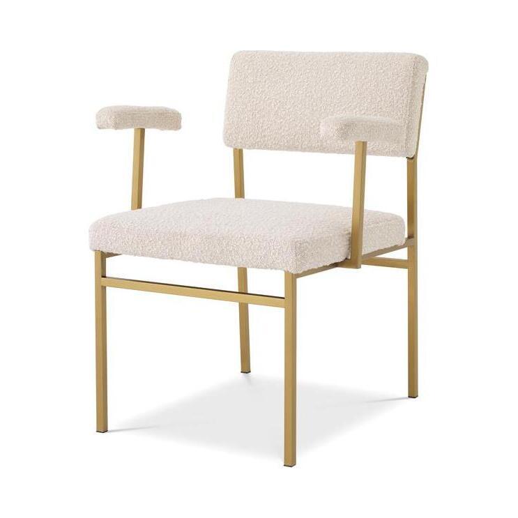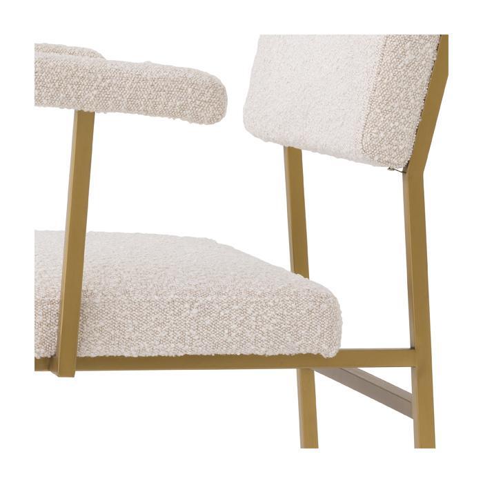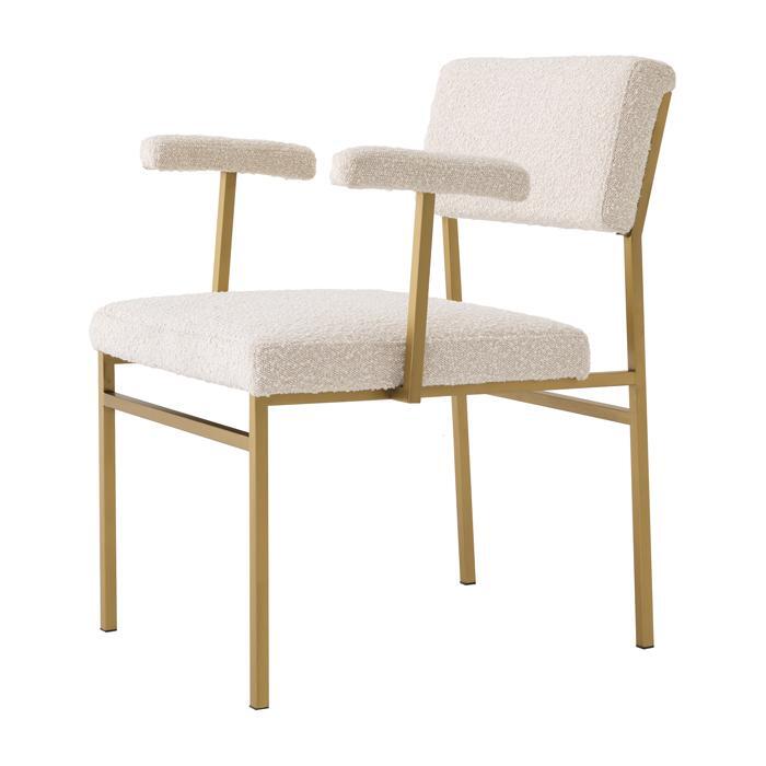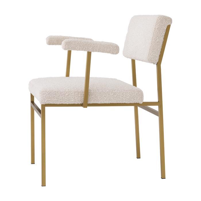 Add a touch of retro Scandinavian style to your dining room or bedroom with Chair Dunmore. With its simple design, this armchair is a perfect fit for minimalist and Japandi style interiors. Its soft touch cream-coloured bouclé upholstery creates an intriguing contrast compared to the sleek metal frame with brushed brass finish.