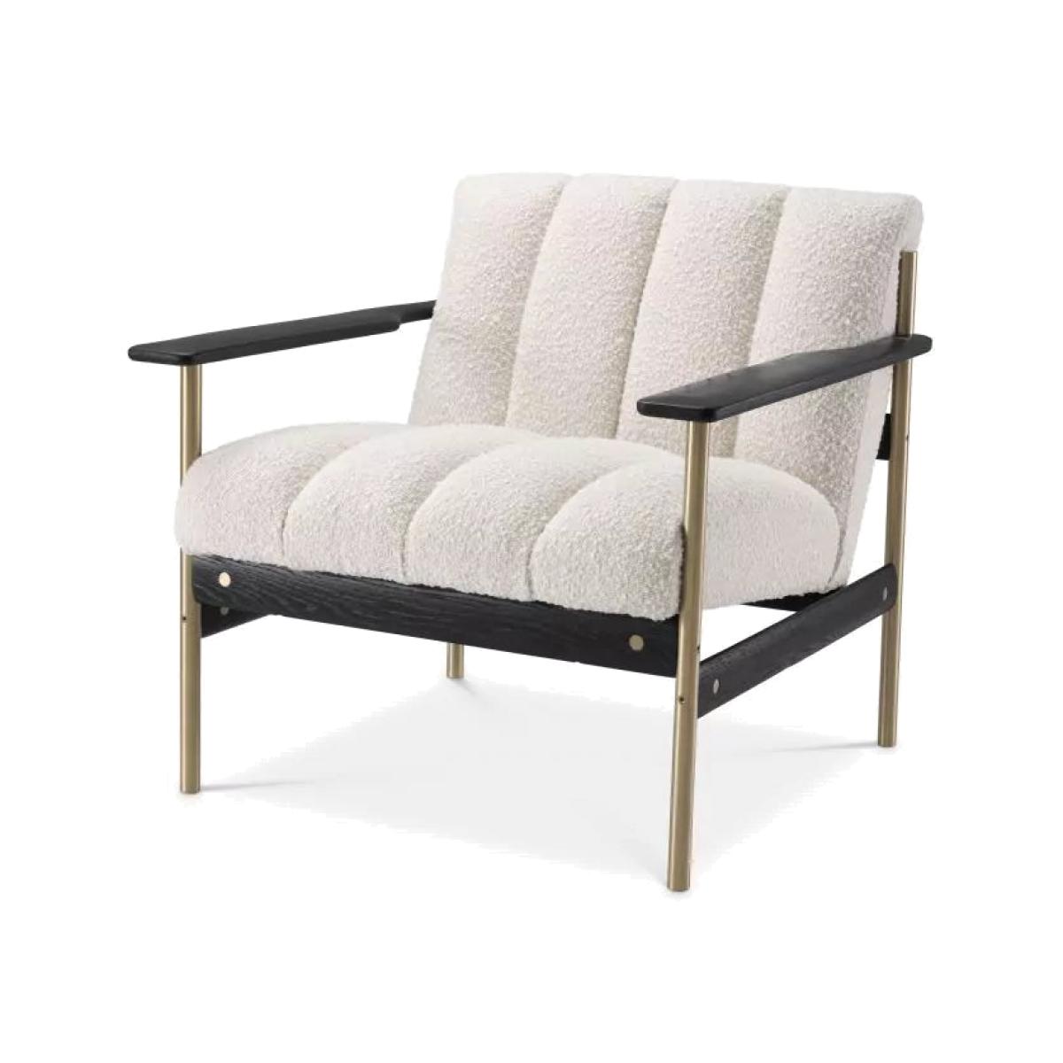 Plump yet refined, Chair Elan pairs ultimate comfort with sleek proportions for modern living. The brushed brass finish frame has armrests and connecting pieces of black finish wood with an open grain structure, while the seat and backrest are upholstered in Bouclé cream and provided with deep-channel stitching. Dimensions: H:73cm x W:75cm x D: 78cm
