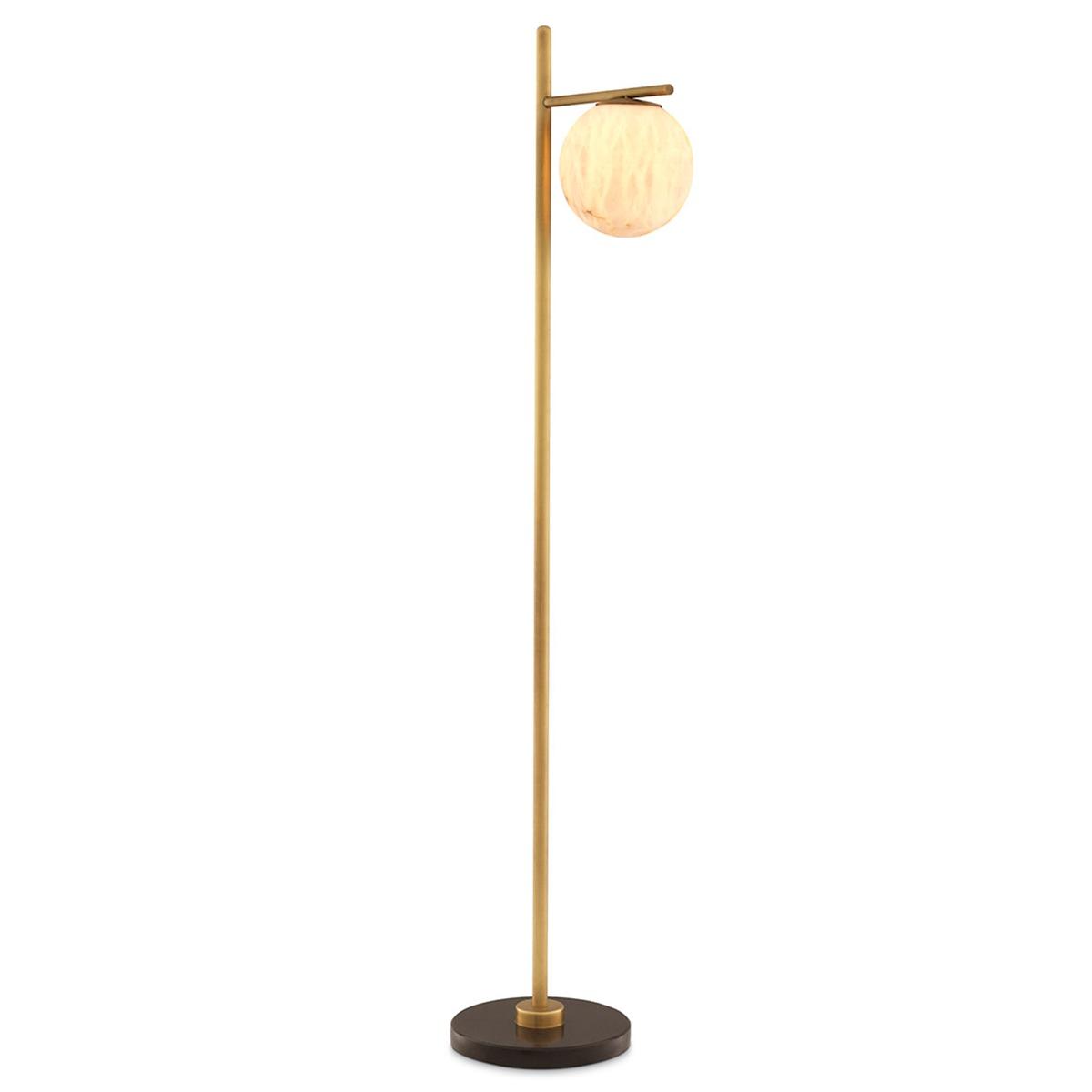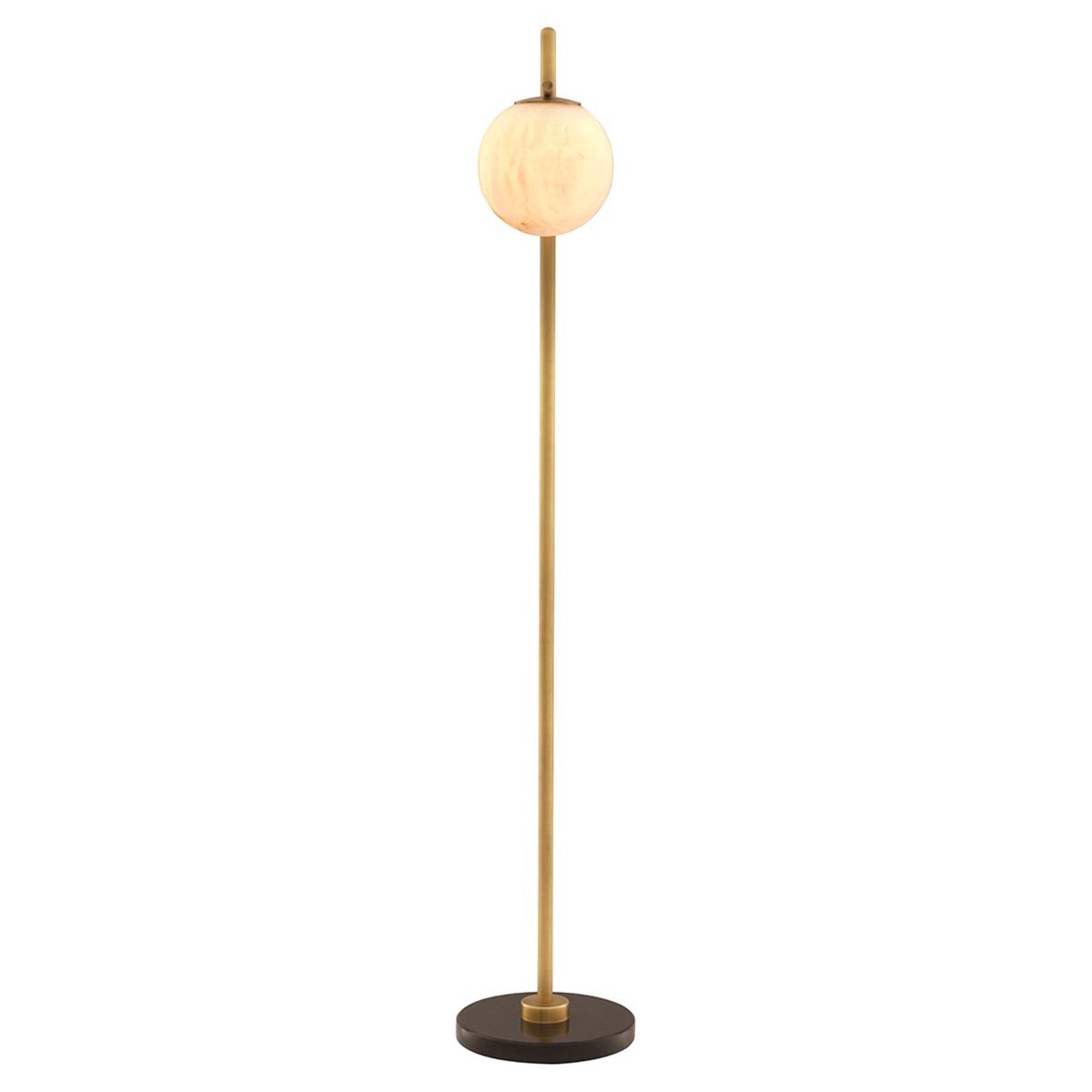 The Faloria Floor Lamp will have you longing for moonlit summer nights with its warm tones and softly illuminating glow. The silky antique brass frame stands on a black marble base, supporting a beautiful spherical alabaster lamp. When lit, the delicate veins of the lamp can be seen, bringing a level of sophistication and opulence like no other.