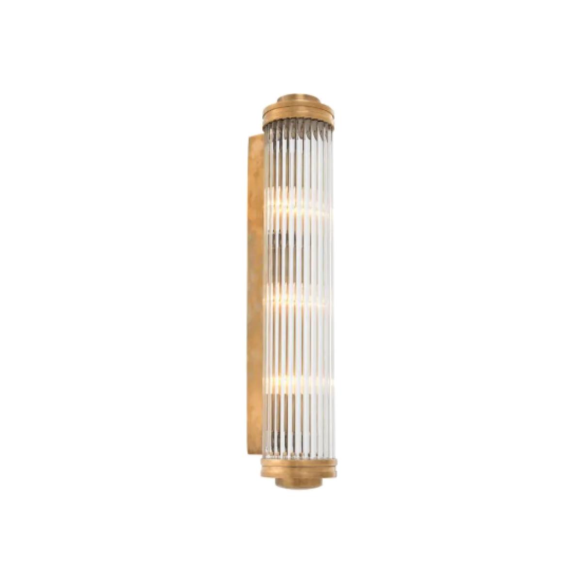 Bathe your interior in a soft and warm glow with the vintage brass finished Gascogne XL Wall Lamp, featuring a shade of ribbed and bevelled clear glass. Inspired by Art Deco theater lamps, this alluring sconce will add cosmopolitan style and glamour to your home décor. Dimensions:  W. 11 | D. 14 | H. 60 cm