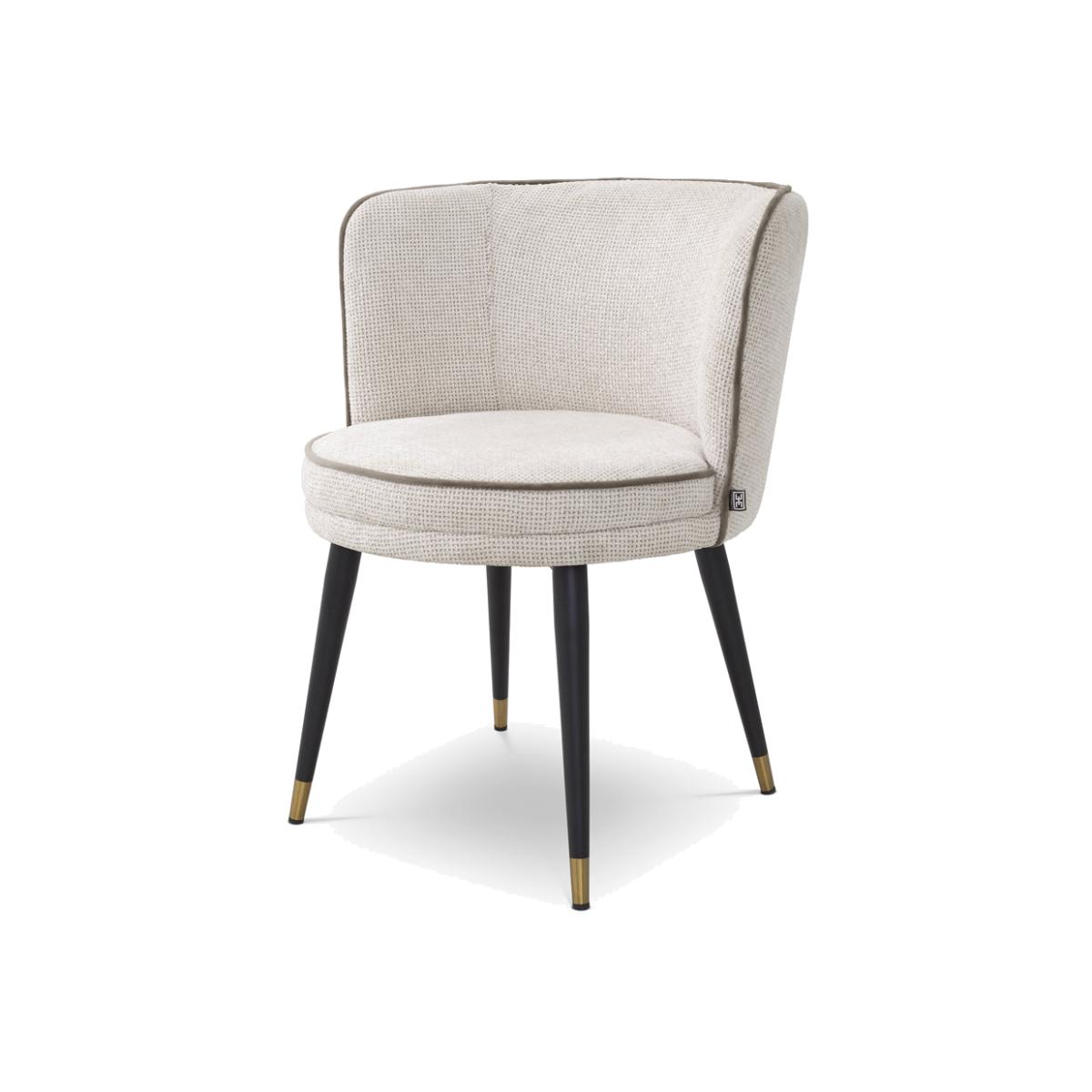 Be on trend with the beautiful Grenada Dining Chair. This gorgeous retro chair features black tapered legs with brass caps and a swivel seat. The seat and backrest feature a Lyssa off-white upholst. View More. Be on trend with the beautiful Grenada Dining Chair. This gorgeous retro chair features black tapered legs with brass caps and a swivel seat. The seat and backrest feature a Lyssa off-white upholstery that is finished with greige velvet piping. Exuding a Mid-Century Modern vibe, this dining chair will add vintage charm to your dining room or kitchen.