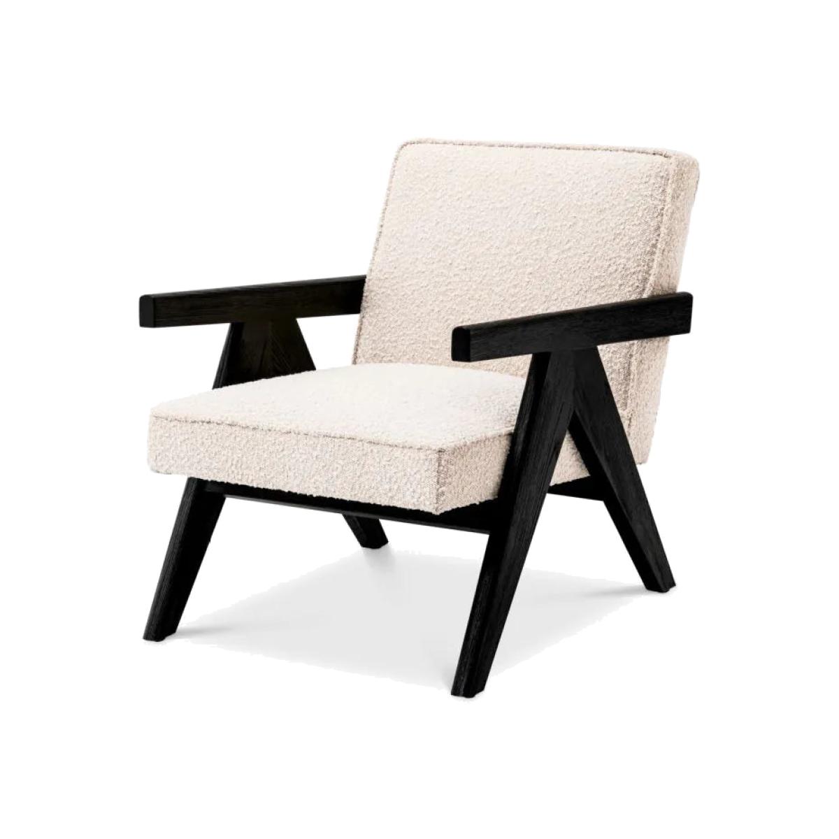 Chair Greta pairs a vintage look with ultimate seating comfort. Crafted from solid wood with a black finish, this beautiful armchair features the V-shaped legs that are characteristic of celebrated minimalist designs from the 1950s and 1960s. The seat, backrest and distinguished armrests are upholstered in cream-coloured bouclé and finished with piping. Finish/Colour: Cream, beige