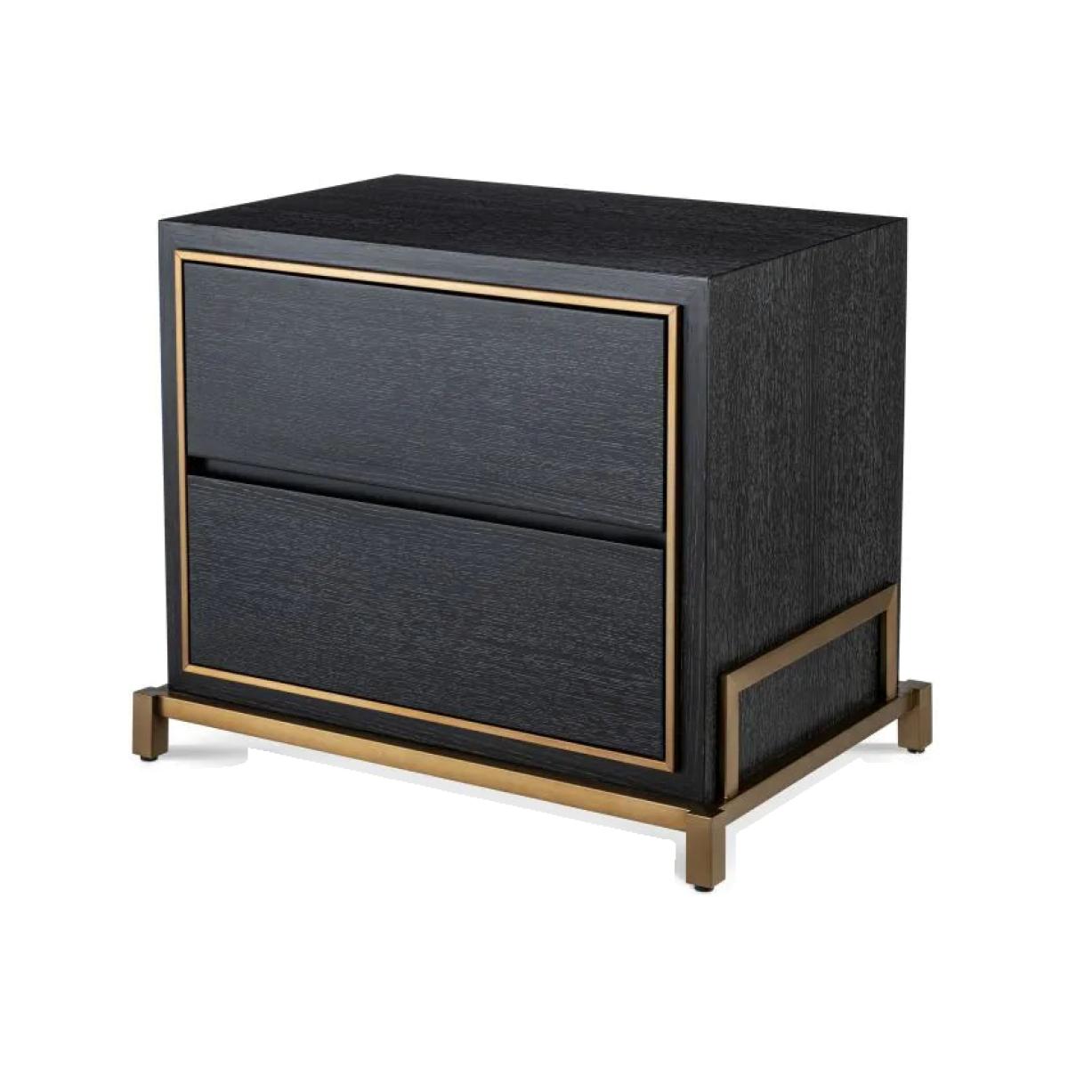 Bedside Table Hazel is a chic and organised nightstand. Wrapped in a charcoal oak veneer casing and embellished with a brushed brass finish frame, this beautiful piece will enhance the style of your bedroom. Both drawers glide open effortlessly, providing ample storage for books, phone accessories, and the like. Finish/Colour: Charcoal