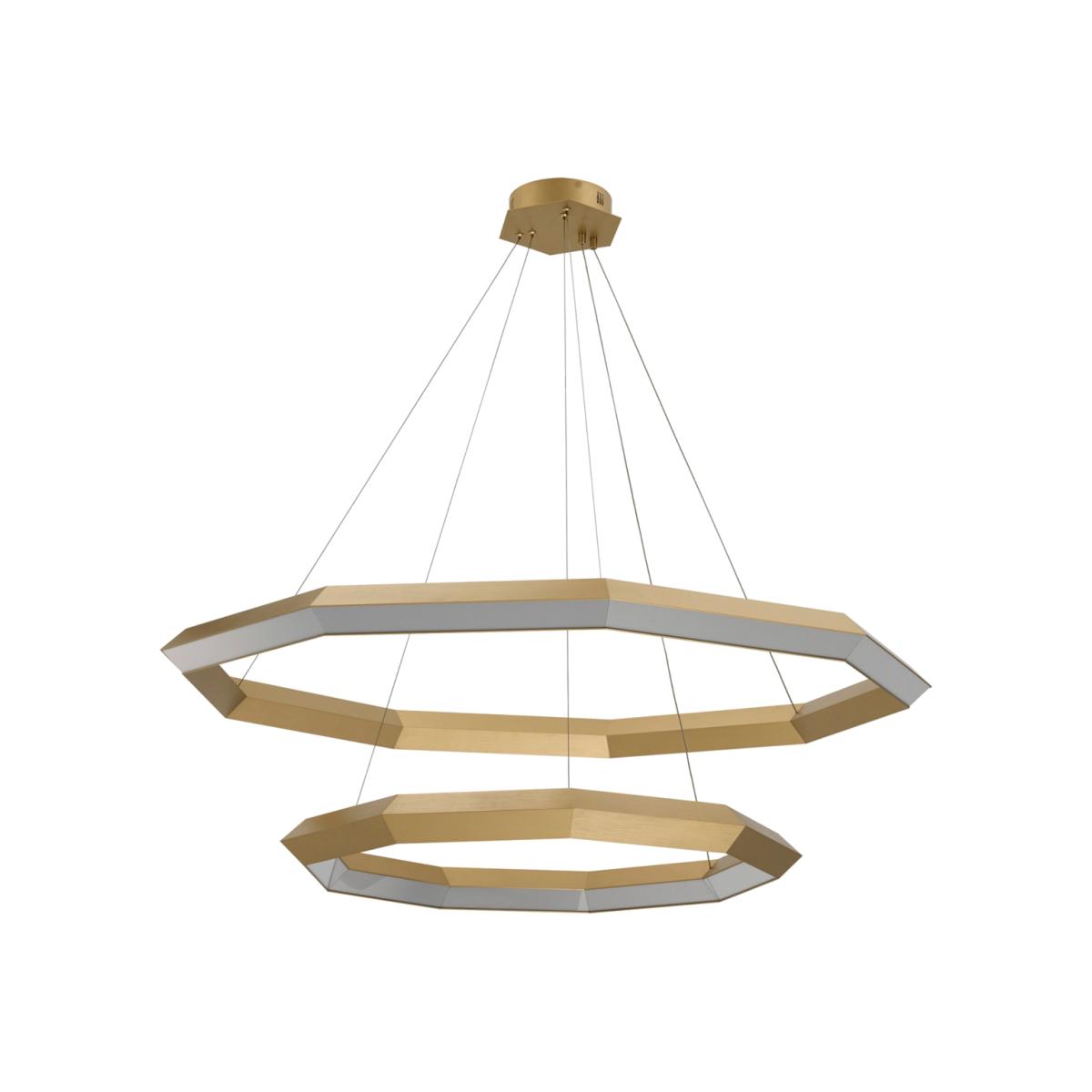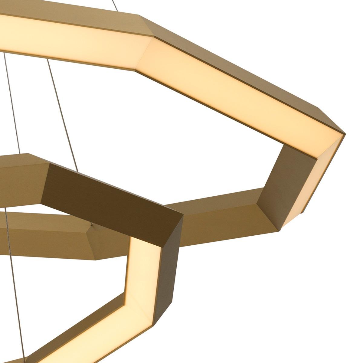 This extraordinary luminaire will certainly make a feature of your home, emitting smooth yet vivid light into its environment. The Helvetia Chandelier consists of two metal nine-sided polygons with integrated LEDs in an antique brass finish. The large element shines outward whilst the small shines inward for an interesting dynamic and is suspended by steel cables to give the illusion they are floating. A minimal and contemporary fixture, the Helvetia Chandelier is perfect for both residential and commercial use.