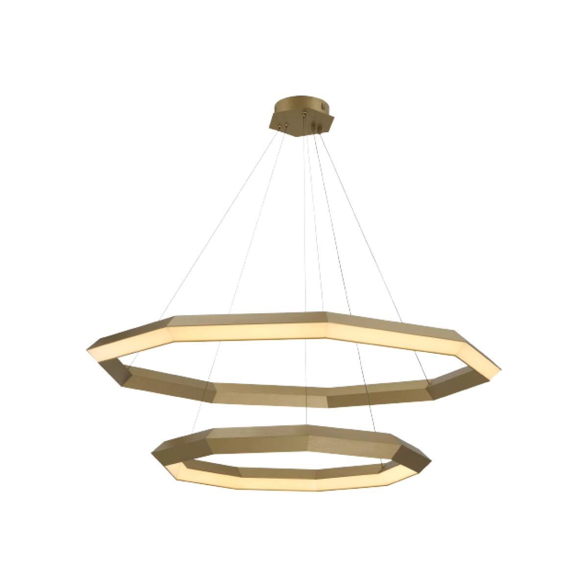 The enticing Helvetia Chandelier consists of two metal nine-sided polygons with integrated LED lights that form an ultra-stylish lampshade. Featuring an antique brass finish, the upper nonagon of this extraordinary luminaire shines outwards and the lower one shines inwards. Both light sources ensure pleasant, bright light and thus create a vivid atmosphere in the room. Due to the fastening with thin steel cables, the fixture almost seems to float. The polygons can be hung in any desired position by adjusting the length of the cables. Dimensions:ø 120 ø 80 x max H. 245 cm
