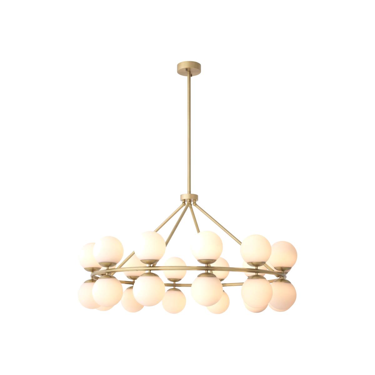 With a nod to medieval lighting fixtures and a hint of retro style, the modern Hutchinson Chandelier features a circular hooped frame with an antique brass finish and 12 whites globes on either side. A great lighting solution that is suitable for both residential interiors and hospitality décors.