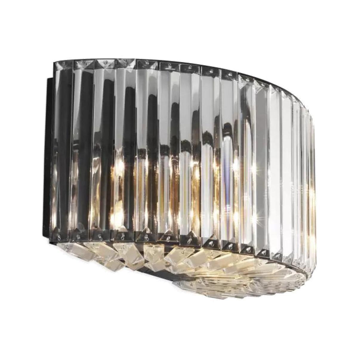 Set the mood for mellow moments with the Art Deco inspired Infinity Wall Lamp. Very atmospheric in your bedroom, hallway or living room. The gunmetal finished fixture features a semi-circular lampshade of crystal glass rods for a soft and warm glow. Wall Lamp Infinity Gunmetal finish | crystal glass Dimensions: W42xH20xD23cm . Weight: 6kg Finish: Gunmetal finish | crystal glass