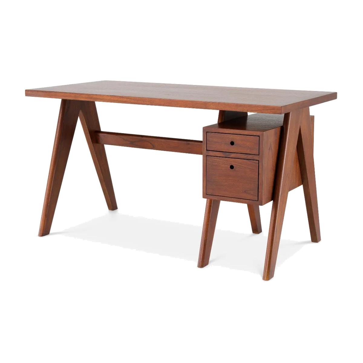 Thanks to its Mid-Century Modern design with clear minimalist silhouette, Desk Jullien will look great in your lounge, bedroom or home office. Made of solid wood, this restrained writing table is provided with a classic brown finish. With an open shelf and a cupboard with two drawers, it offers ample storage space for your laptop, documents, writing supplies and charging cables. Finish/Colour: Brown