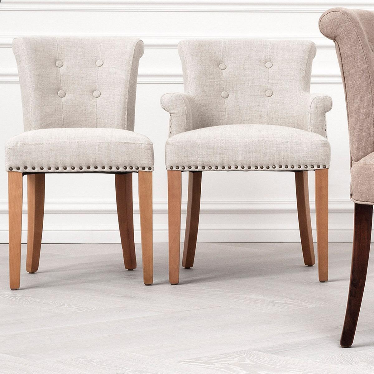 The Key Largo Dining Chair allows for long-lasting enjoyment with family and friends around the dining table with accommodating features for your comfort, all whilst maintaining a stylish appearance. Upholstered in an off-white linen with accent buttons, the seat is rounded for your support and stands on a handcrafted natural wood frame. Completed with antique bronze nails and a brass handle on the back, Key Largo is a modern take on a classic design.