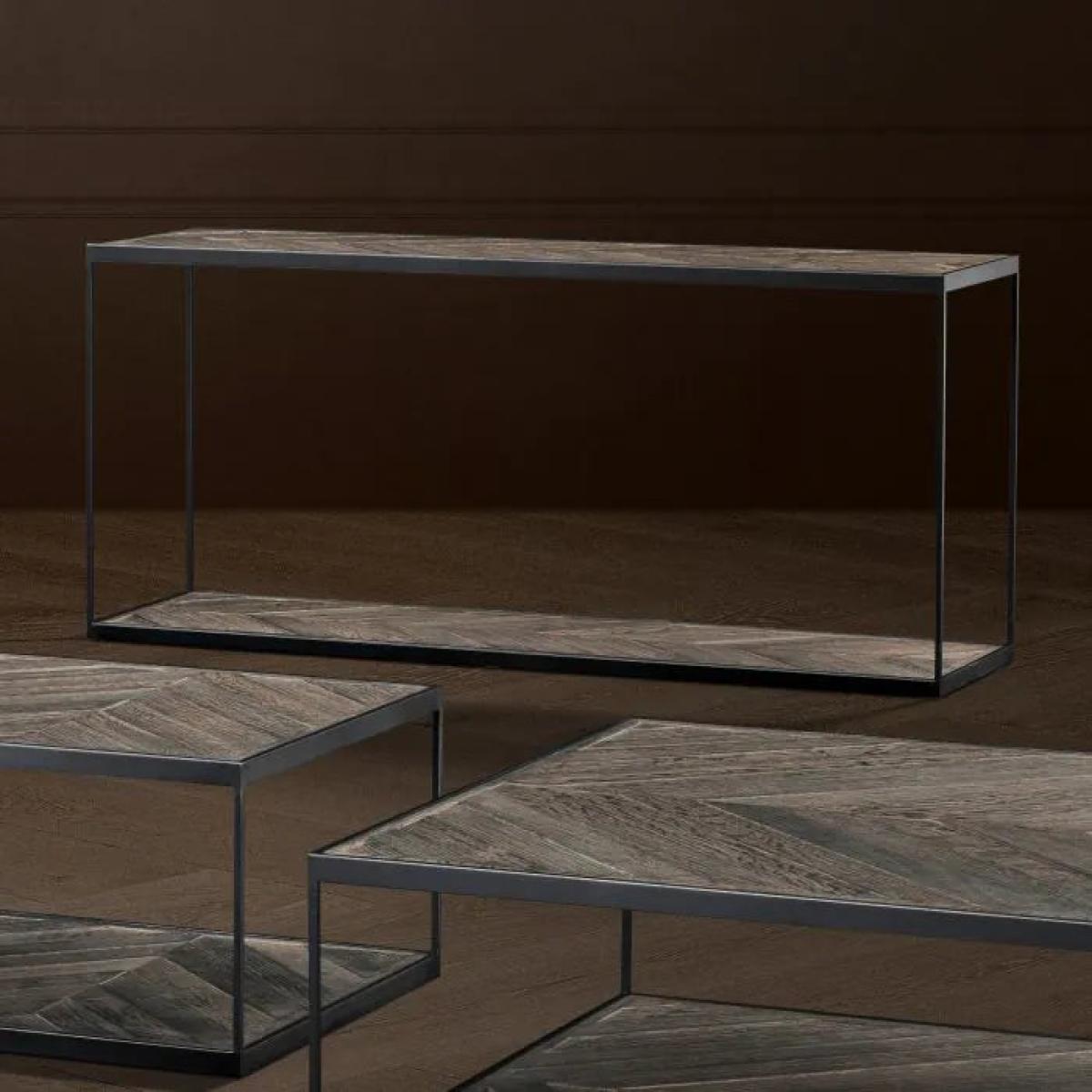 Instantly elevate the look of your hallway or living room with the La Varenne Console Table. This stylish console table comprises a zinc finished steel frame with an weathered oak table top that nestles an equally proportioned low shelf surface below. Mix and match with design furniture and luxury lighting from the Eichholtz collection for an eclectic interior style. Finish/Colour:Weathered oak