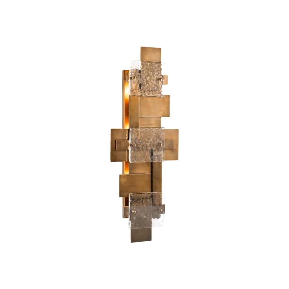 Create depth and visual interest in your home décor with the geometric Langham Wall Lamp. Its decorative multi-layered design incorporates stamped out linear plates in a vintage brass finish and three square glass plates with relief. Dimensions:29,5 x H. 77 x D. 11 cm