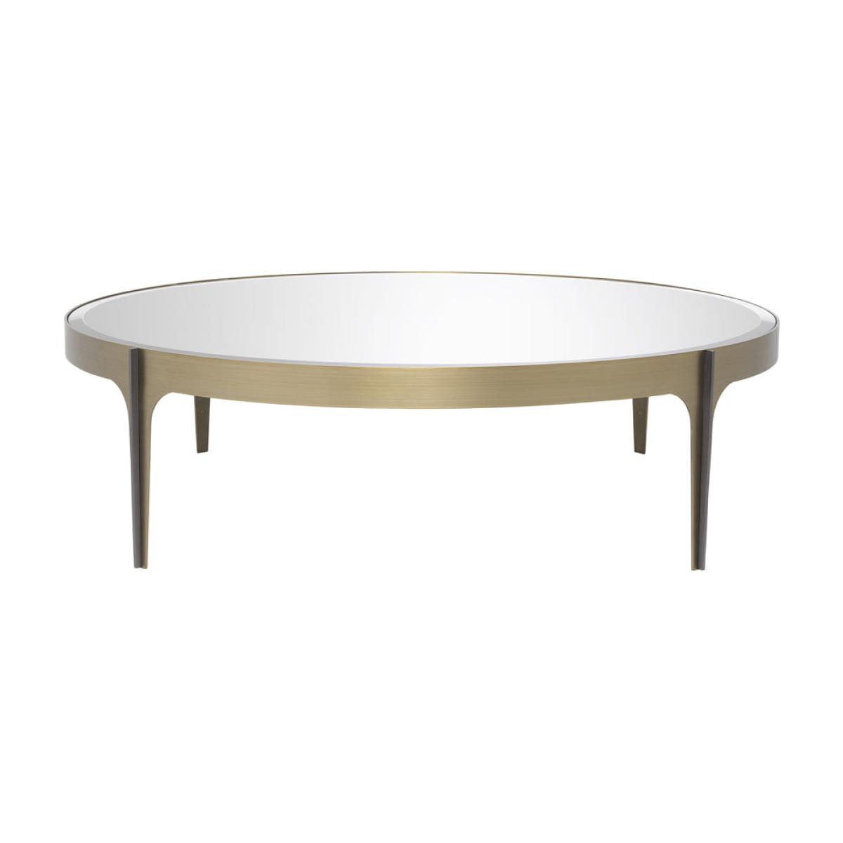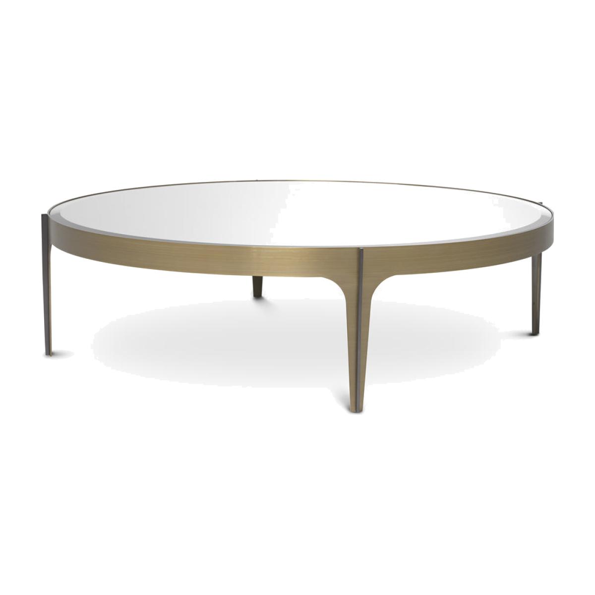 With a Mid-Century Modern design and chic appeal, the large Coffee Table Artemisa makes a statement with an elegant metal frame in a brushed brass finish. The interior curves of the frame are accen. View More. With a Mid-Century Modern design and chic appeal, the large Coffee Table Artemisa makes a statement with an elegant metal frame in a brushed brass finish. The interior curves of the frame are accentuated by sleek bronze bars on the legs and a round tabletop of bevelled mirror glass, bringing focus to the spaciousness within the solid materials shaping this piece. Combine with the small Artemisa Coffee Table for a balanced look.