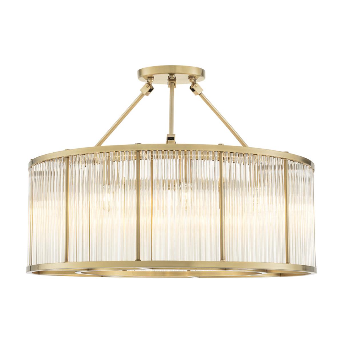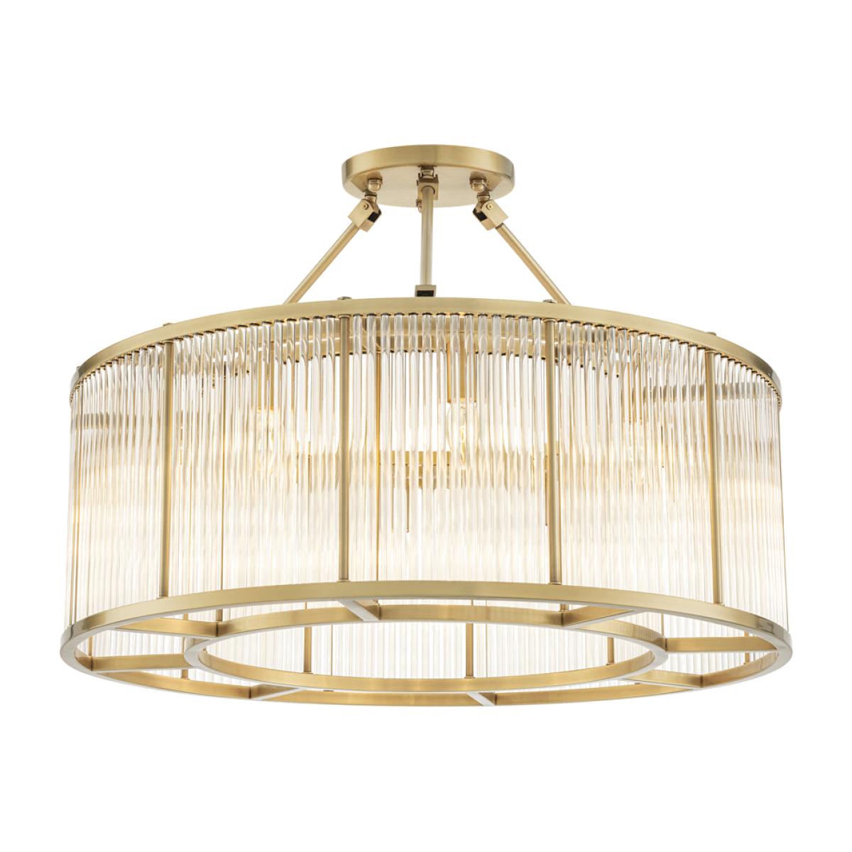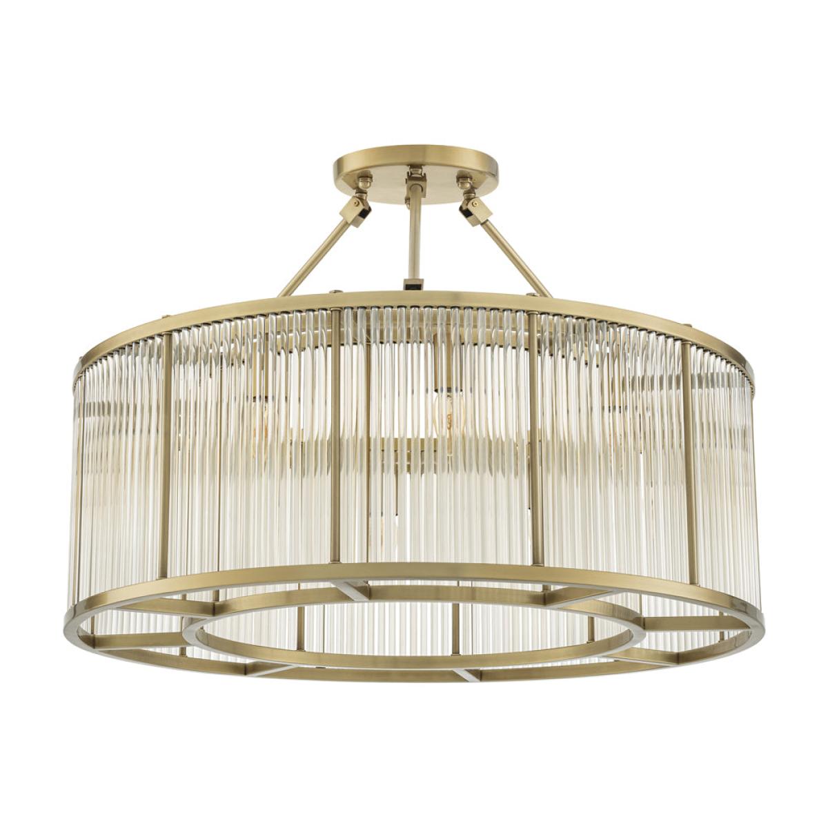 With its pronounced 1920s appeal this enthralling Art Deco inspired Bernardi Ceiling Lamp enlivens each space in a sparkling way. Featuring a tier of sparkling glass rods, the drum-shaped lampshade of this semi-flush mount fixture has an antique brass finish for an elegant contrast. Dimensions: H: 61 x Dia: 80 cm Materials: Glass Assembly Required: No. Care instructions: For general maintenance, periodically dust off your lighting with a feather duster or a soft clean cloth, preferably weekly. Downloads: Product Specification Sheet