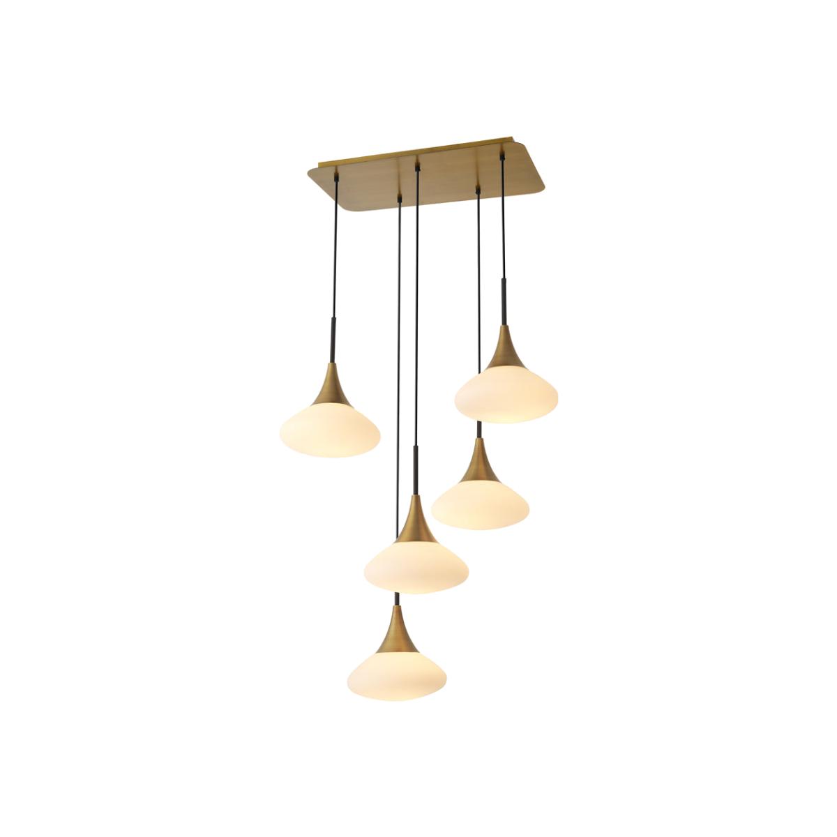 Equally at home in modern and traditional interiors, the 5-light cluster Chandelier Duco brings style as it shines a light in your space. Hanging from a rectangular ceiling plate and provided with. View More. Equally at home in modern and traditional interiors, the 5-light cluster Chandelier Duco brings style as it shines a light in your space. Hanging from a rectangular ceiling plate and provided with an antique brass finish, it features five cables with funnel-shaped holders and elliptical white glass shades that cast an ambient light on your interior surroundings. The cables are adjustable in length, enabling you to shape the chandelier to your wishes.