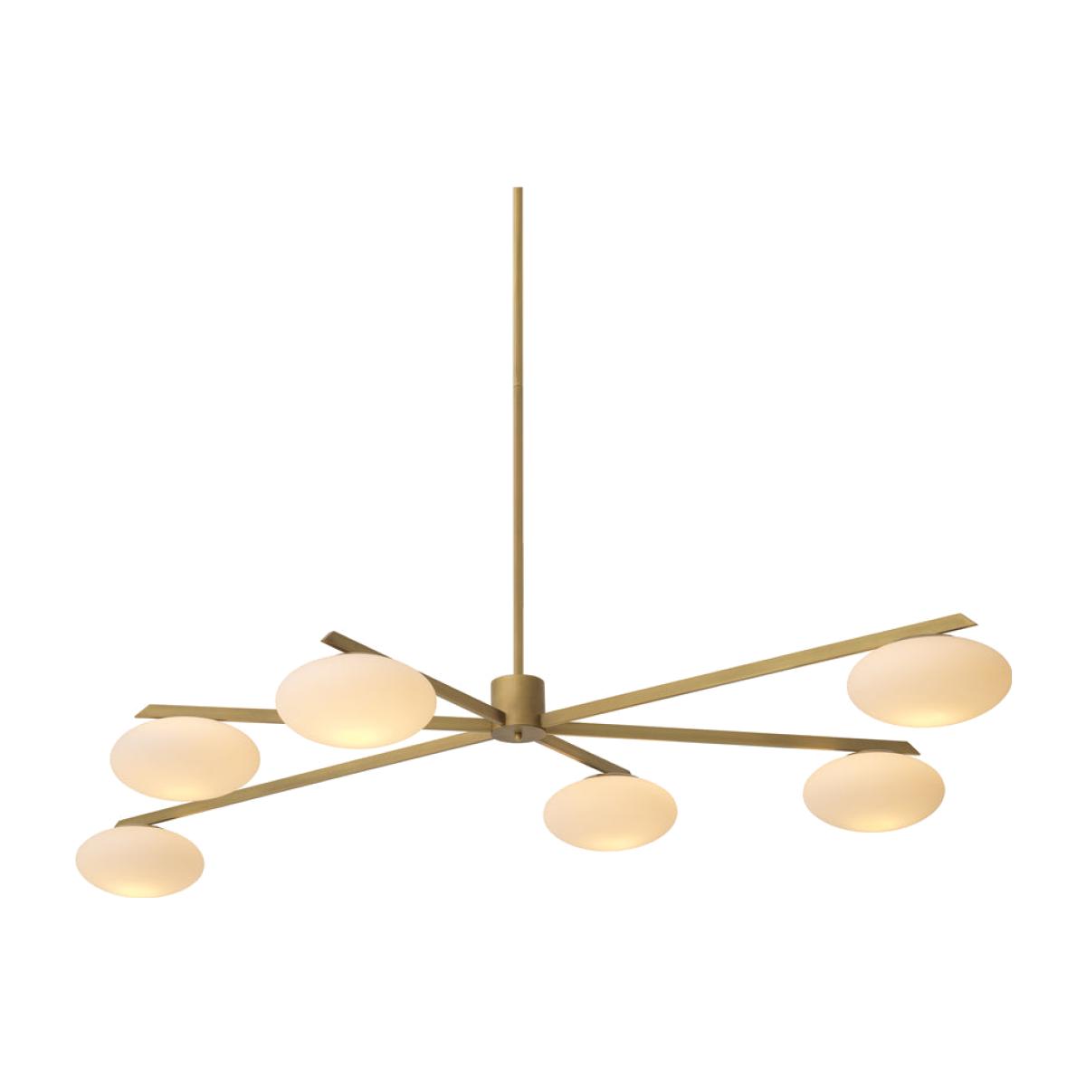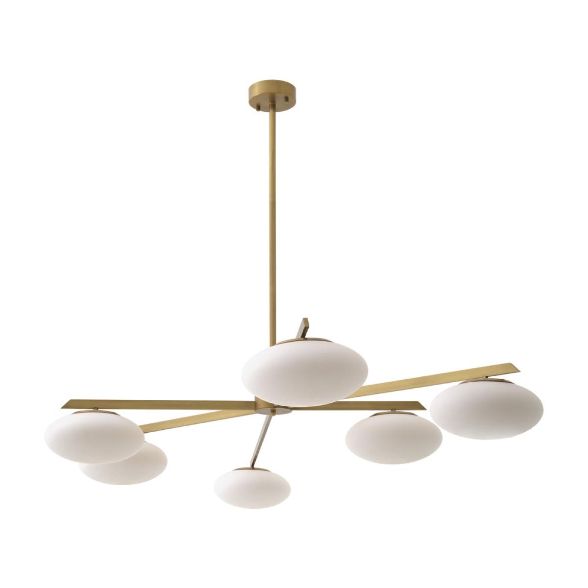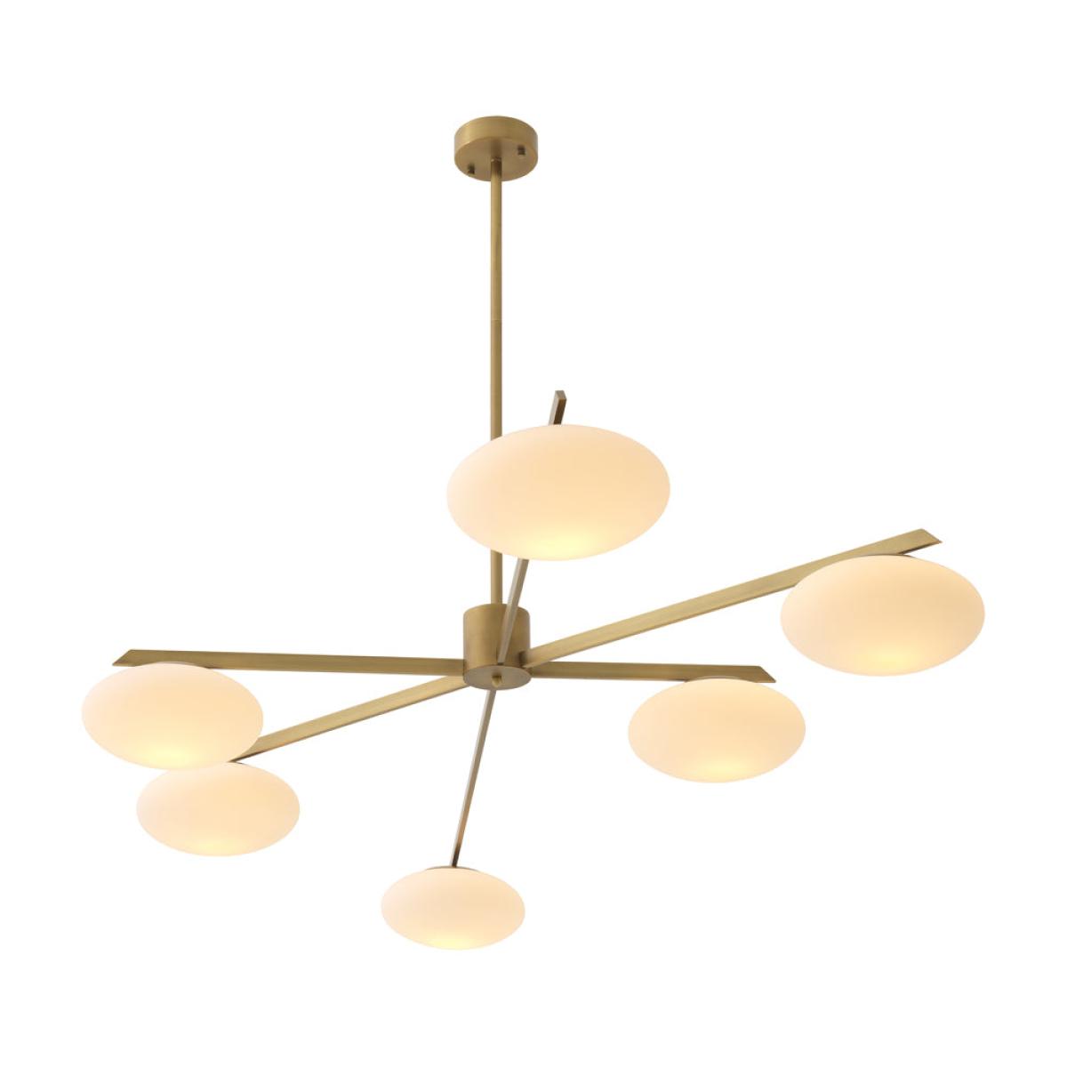 Add a dash of Mid-Century Modern style to your home with the large Evergreen Chandelier. A highlight in any room, this 6-light sputnik chandelier features a striking silhouette. Provided with an an. View More. Add a dash of Mid-Century Modern style to your home with the large Evergreen Chandelier. A highlight in any room, this 6-light sputnik chandelier features a striking silhouette. Provided with an antique brass finish, this statement lighting piece contains six elliptical lampshades of white glass. The fixture is supplied with 3 stems in different lengths, so you can use it as a semi-flush mount ceiling light or a pendant light.