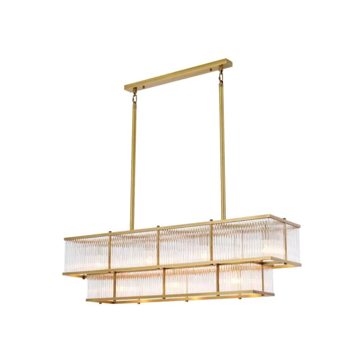 Channel glamorous Art Deco style into your home with Chandelier Le Marais. This stunning vintage style tapered chandelier with antique brass finish exudes the vibrant atmosphere of the roaring 1920s. Two levels of clear glass rods disperse a captivating light. Dimensions:L: 120 D: 32.5 x H: 34 cm