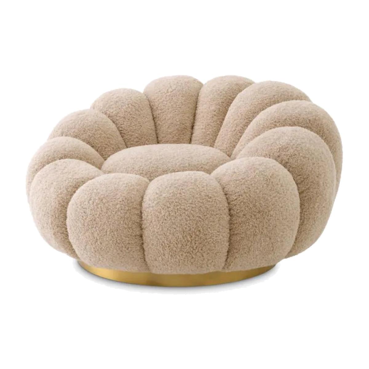 With its relaxing curves and soft-touch upholstery, Swivel Chair Mello will bring opulence to your home. Looking like an open flower, this delightful accent chair with Canberra sand upholstery will be a highly decorative addition to your lounge or bedroom. It is mounted on a brushed brass swivel base. Finish/Colour: Sand