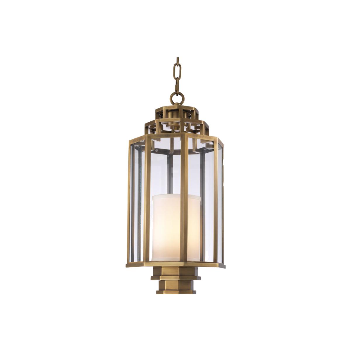 Tastefully blending contemporary design with a touch of industrial flair, the Monticello Lantern is an updated classic. Crafted from metal in an antique brass finish, this craftsman-style design sh. View More. Tastefully blending contemporary design with a touch of industrial flair, the Monticello Lantern is an updated classic. Crafted from metal in an antique brass finish, this craftsman-style design showcases an octagonal frame with clear glass panels around a cylindriccream lampshade.