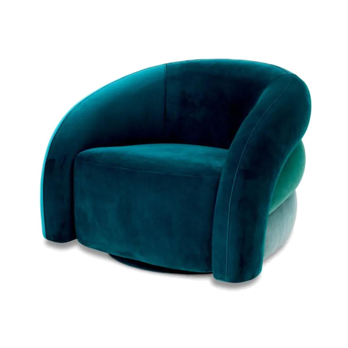 Inspired by post-modern Italian design furniture from the 1970s and 1980s, Chair Novelle is characterised by bold, sculptural forms. A statement piece that can be easily integrated into any contemporary or eclectic interior style. This beautiful swivel armchair has a soft velvet upholstery in three different colours: Savona sea green, turquoise and blue. Finish/Colour: Green