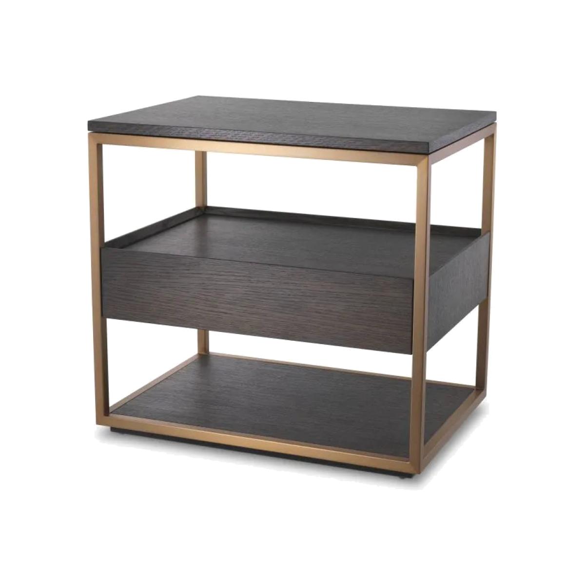 With a metallic frame in a brushed brass finish and a top, body and lower shelf of mocha straight oak veneer, this chic side table features a modern design with a retro twist that elevates the space around it. Including one drawer, it is also well-suited to a dining area or bedroom. Finish/Colour: Brass (brushed)