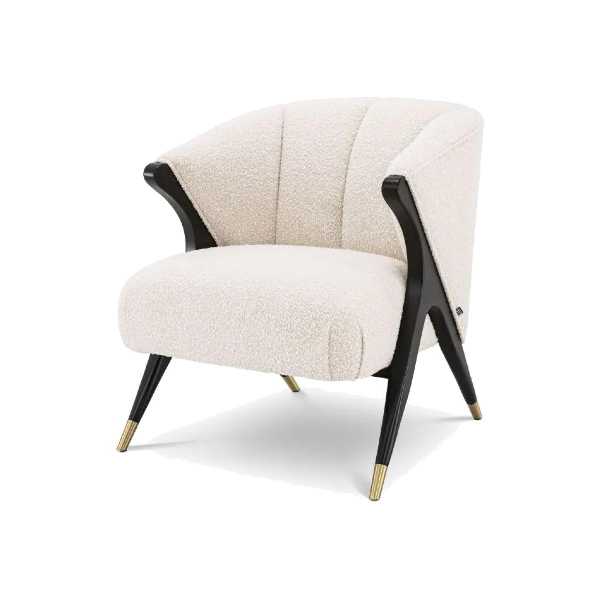 Create an inviting seating option in your living space with the Pavone Chair. Its Mid-Century Modern design will add vintage charm to your lounge interior. Featuring a slim black frame with brass feet and an Bouclé cream upholstery, this accent chair is a perfect choice. Finish/Colour: Cream, beige
