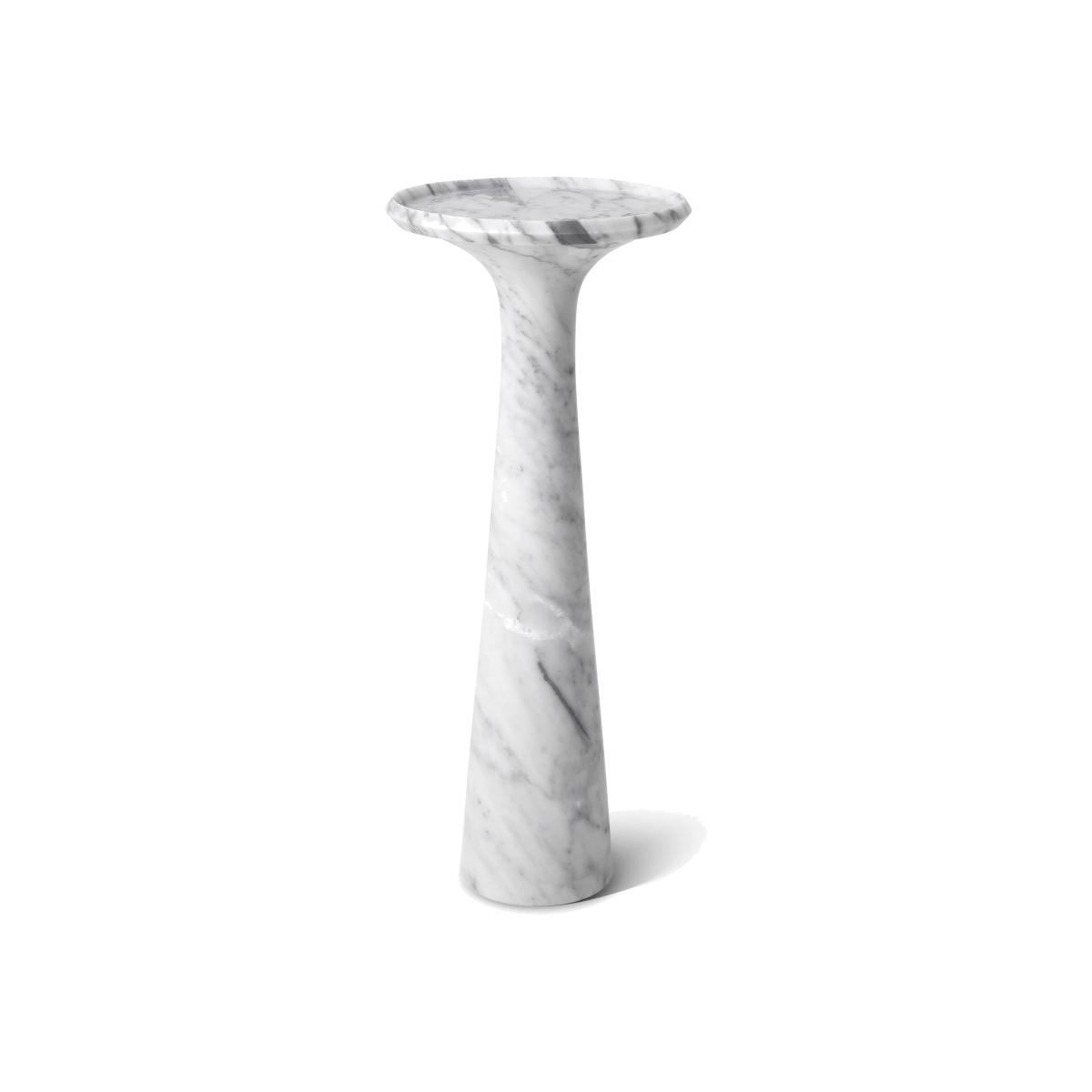 Exuding Palm Springs aesthetic, the high Pompano Side Table recalls the atmosphere of the Californian riviera. It is crafted from solid Italian Carrara marble in a seventies style shape. The top has a raised edge. We love to combine the low and high version of this table to create a stunning set. Finish/Colour: White, Off-white