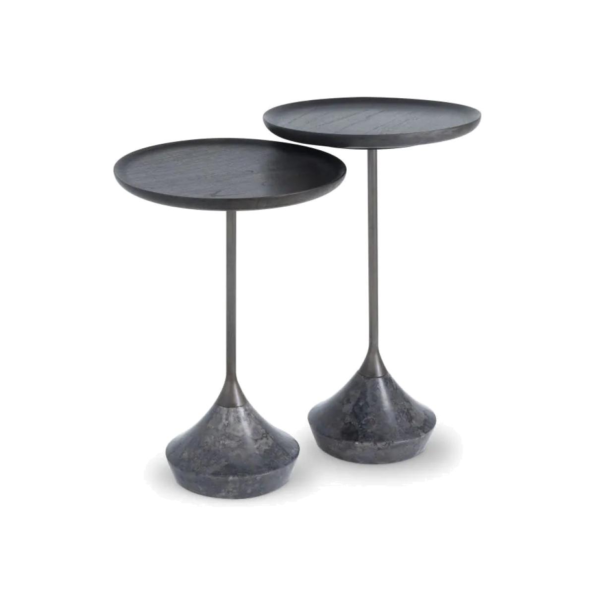 The retro chic 2-piece set of Puglia Side Tables will look amazing in your living room. Dimensions: ø 35 x H. 56 cm | H. 50,5 cm Finish: Grey marble | bronze finish | mocha finish Marble is a natural material, each piece differs in color and veining