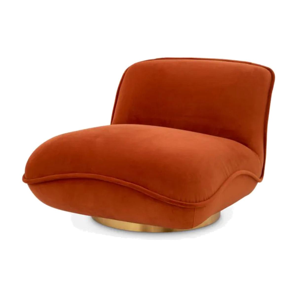 As its name suggests, Chair Relax offers the perfect conditions for afternoon relaxation. Looking like two pillows at right angles to each other, this swivel chair is not only aesthetically pleasing but also highly comfortable. Featuring a Savona orange velvet upholstery with piping and a brushed brass swivel base, this accent chair will be the centre of attention in any living room. Finish/Colour: Orange