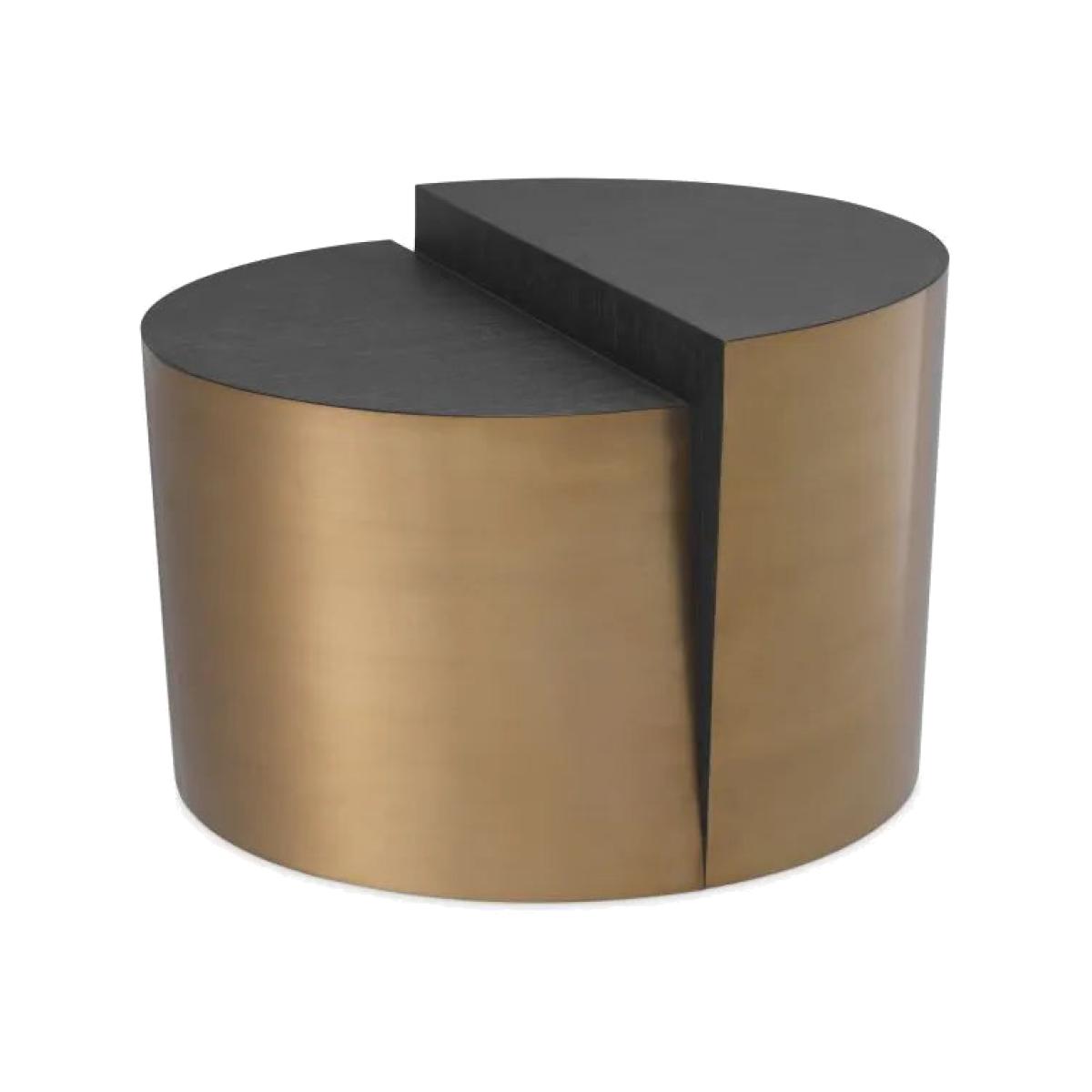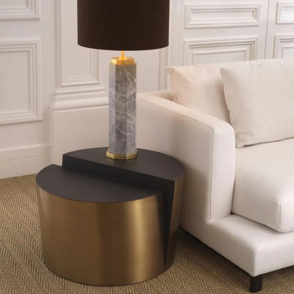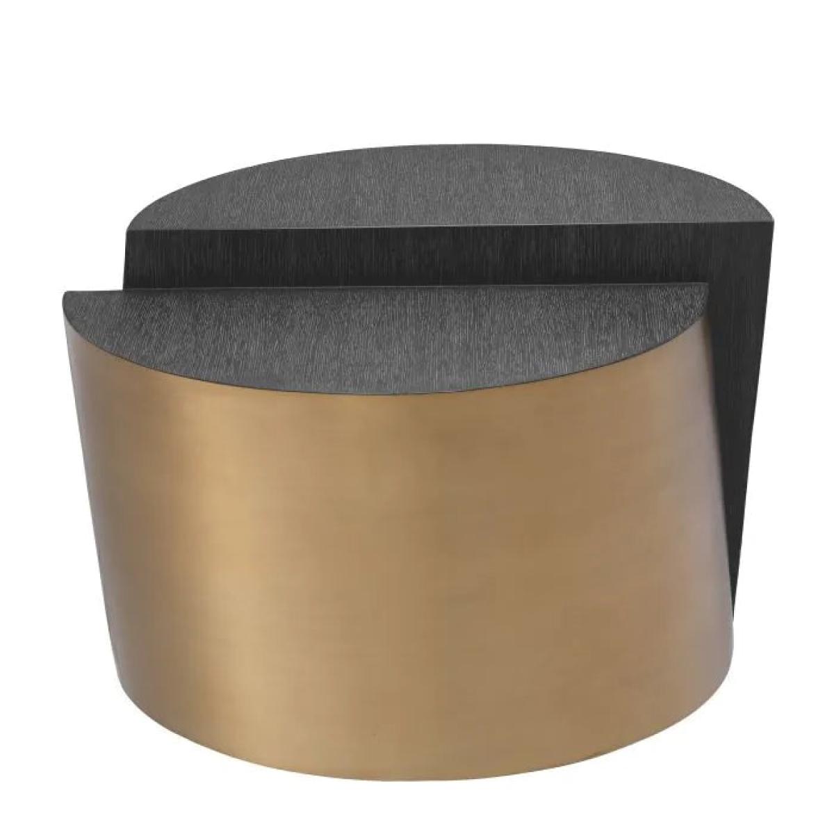 Designed with elegance in mind, the Riviera Side Table makes a stunning style statement in your abode. Crafted from metal in a brushed brass finish, this contemporary end table showcases a split drum shape with 2 half-round surfaces of charcoal grey oak veneer. The warm metallic finish of the base counterpoints the dark tone of the tabletops with striking effect. Finish/Colour: Brass (brushed)