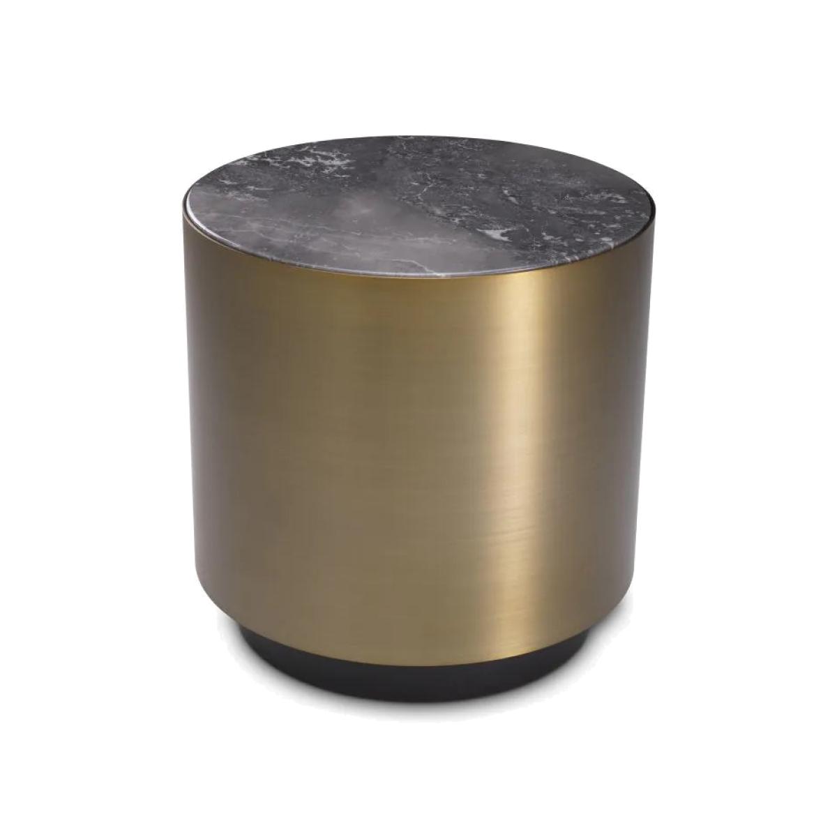 Designed with elegance in mind, Side Table Porter will elevate the style of your abode. Round in shape, this lovely end table pairs a brushed brass casing with a black base and a grey marble top. The warm look of the brass counterpoints the cool tone of the marble with striking effect. Dimensions: ø 50 x H. 50 cm Finish: Brushed brass finish | grey marble | black finish base Marble is a natural material, each piece differs in color and veining