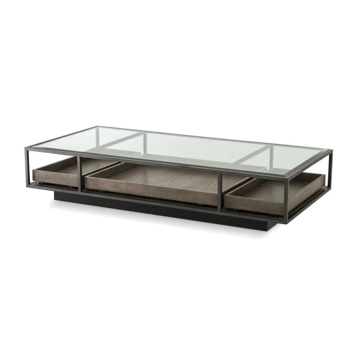 Coffee Table Roxton is a striking surface for display. The bottom of its bronze finish frame is provided with three grey veneer pull-out drawers on rails, so your magazines and remote control are always clearly visible under the glass top, and ready for use. Bronze finish | clear glass | grey veneer Dimensions: 180 x 90 x H. 37 cm