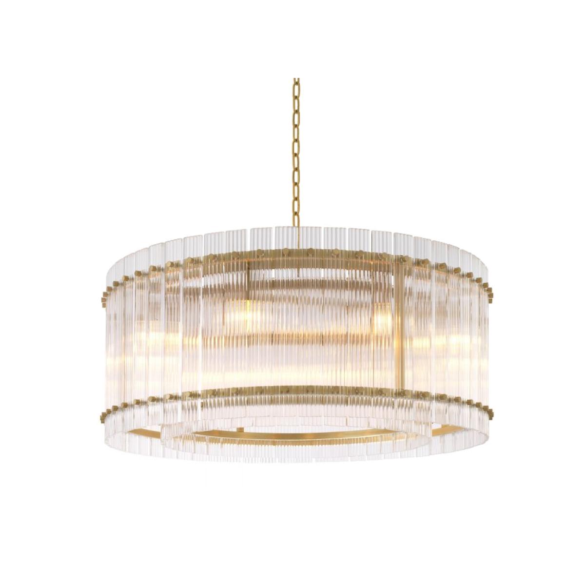Chandelier Ruby brings atmospheric light into every room. A modern take on classic style, this stunning pendant lamp with an antique brass finish features a drum lampshade covered with vertical ribbed glass plates. Dimensions: ø 94 x H. 43 cm