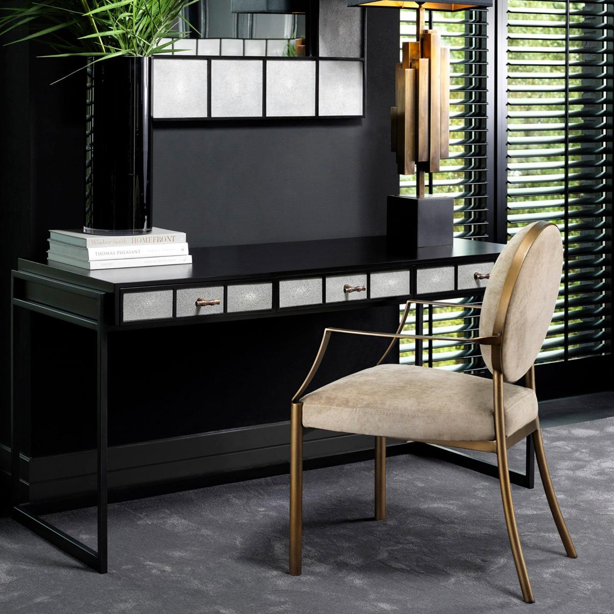 The Scribe Dining Chair with Arms is inspired by Art Deco furniture from the roaring 1920s. This metal dining chair has a dark brass finish and upholstered in griege velvet for a super soft touch. The sleekly curving back legs round this piece off as a classic decor statement to have around your dining table.