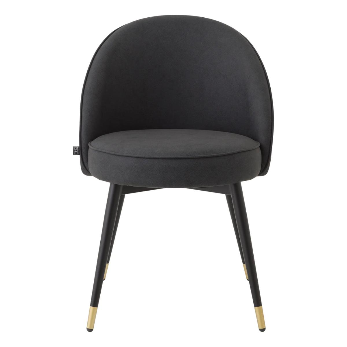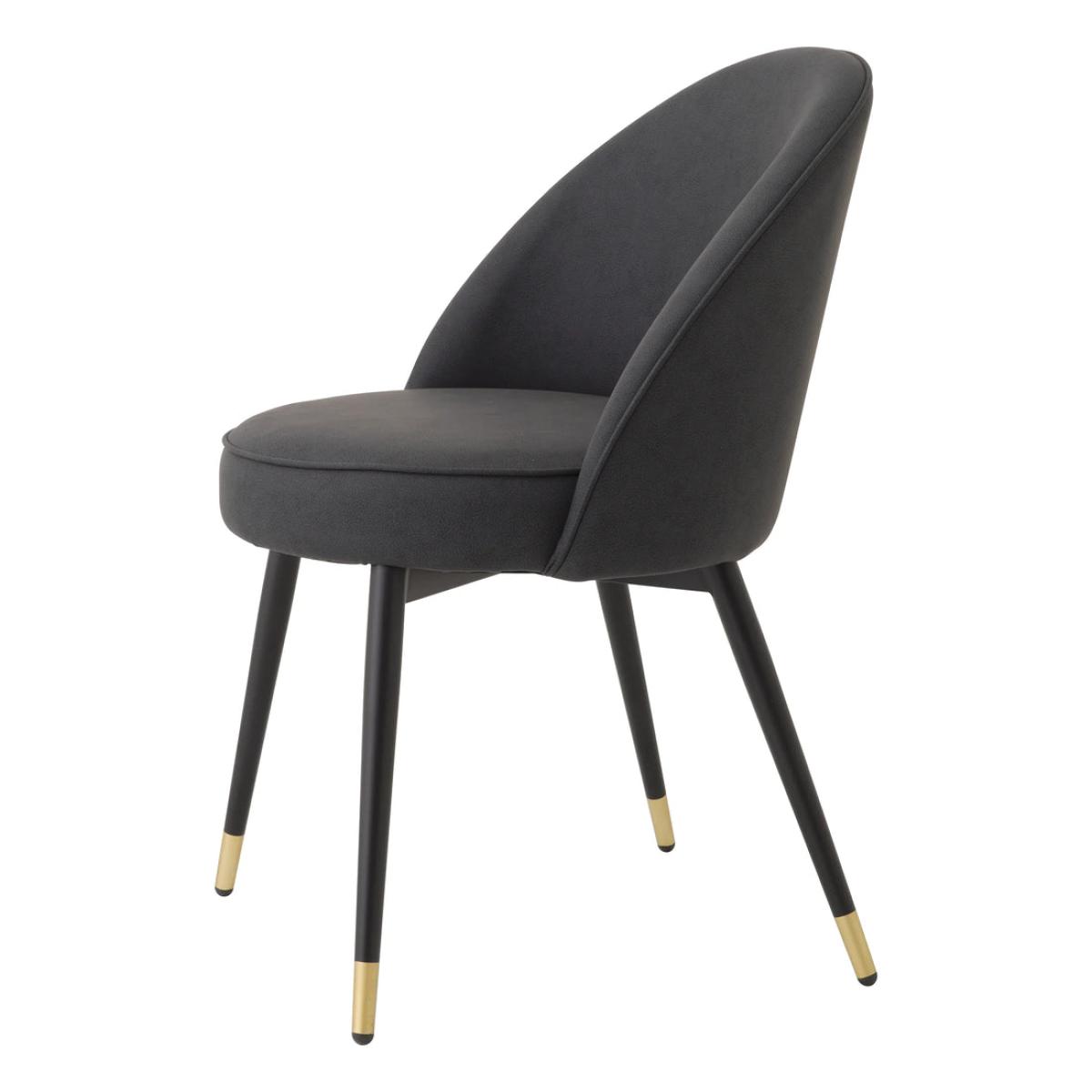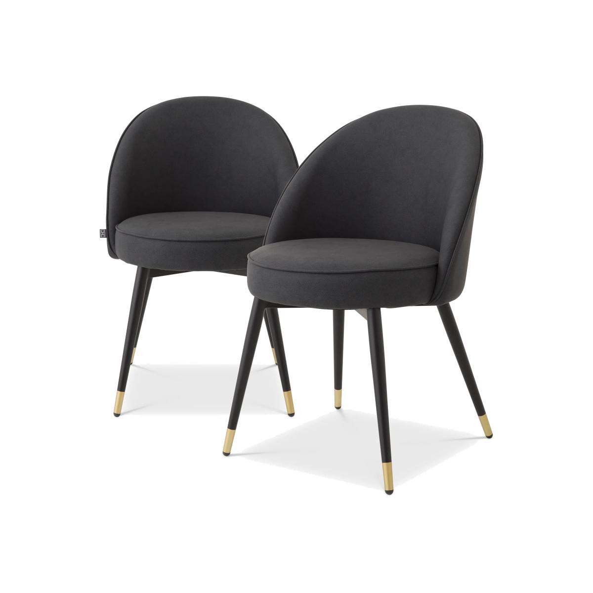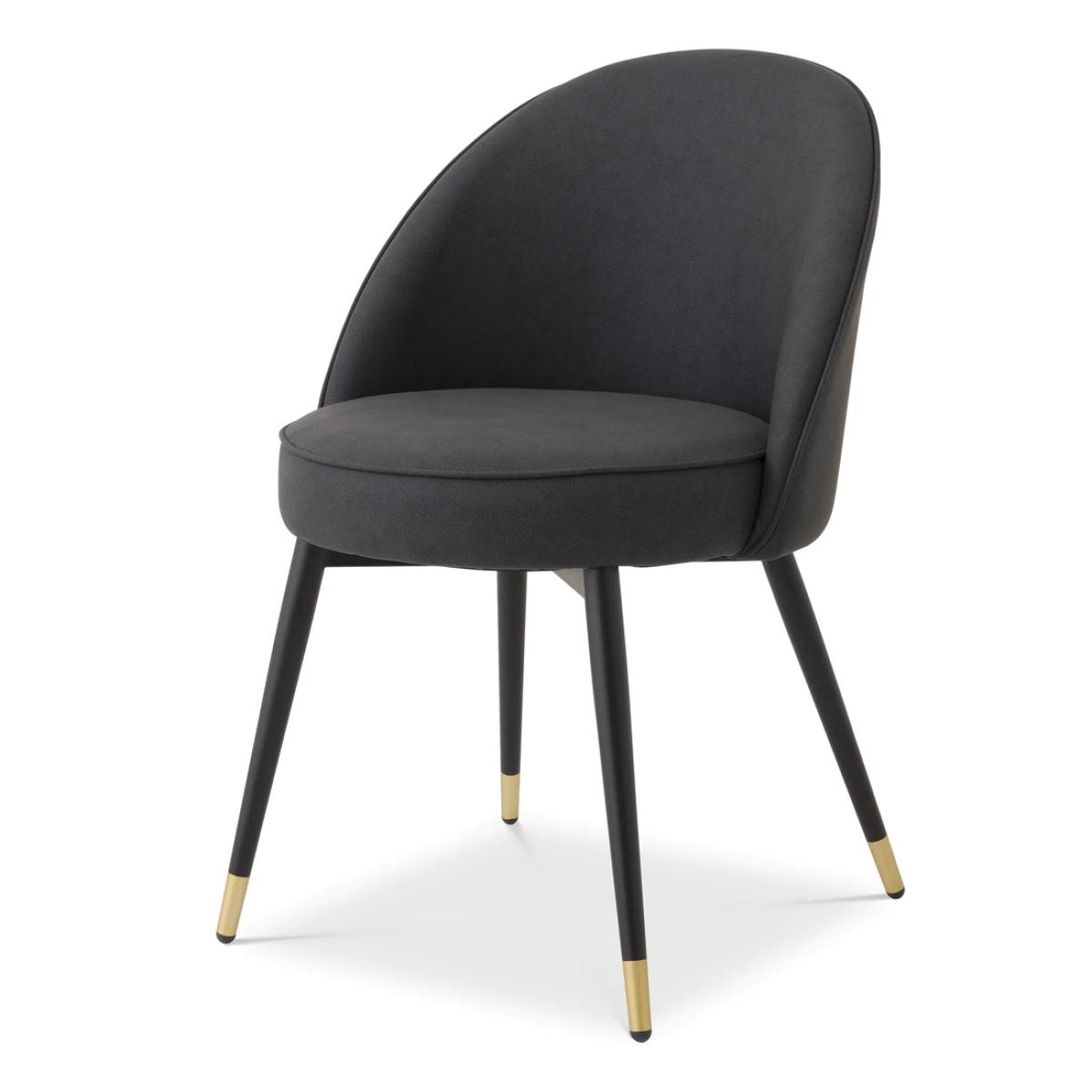 Add Mid-Century Modern appeal to your dining room or kitchen with this stylish set of 2 Cooper Dining Chairs. Each chair is characterised by a seating and backrest in a grey faux-leather upholstery with piping, tapered black legs and brass caps.