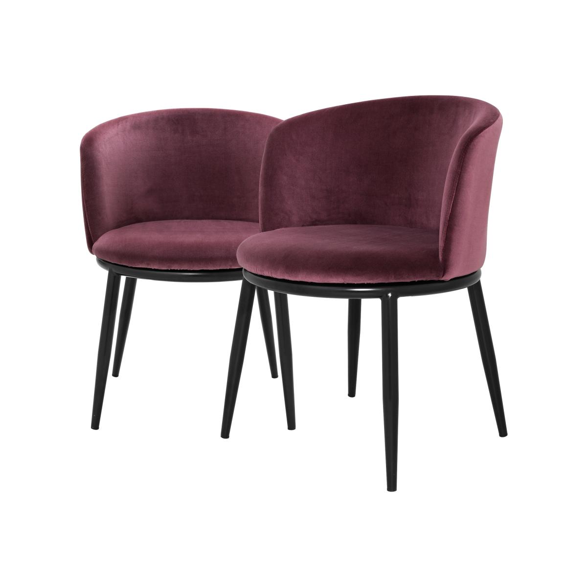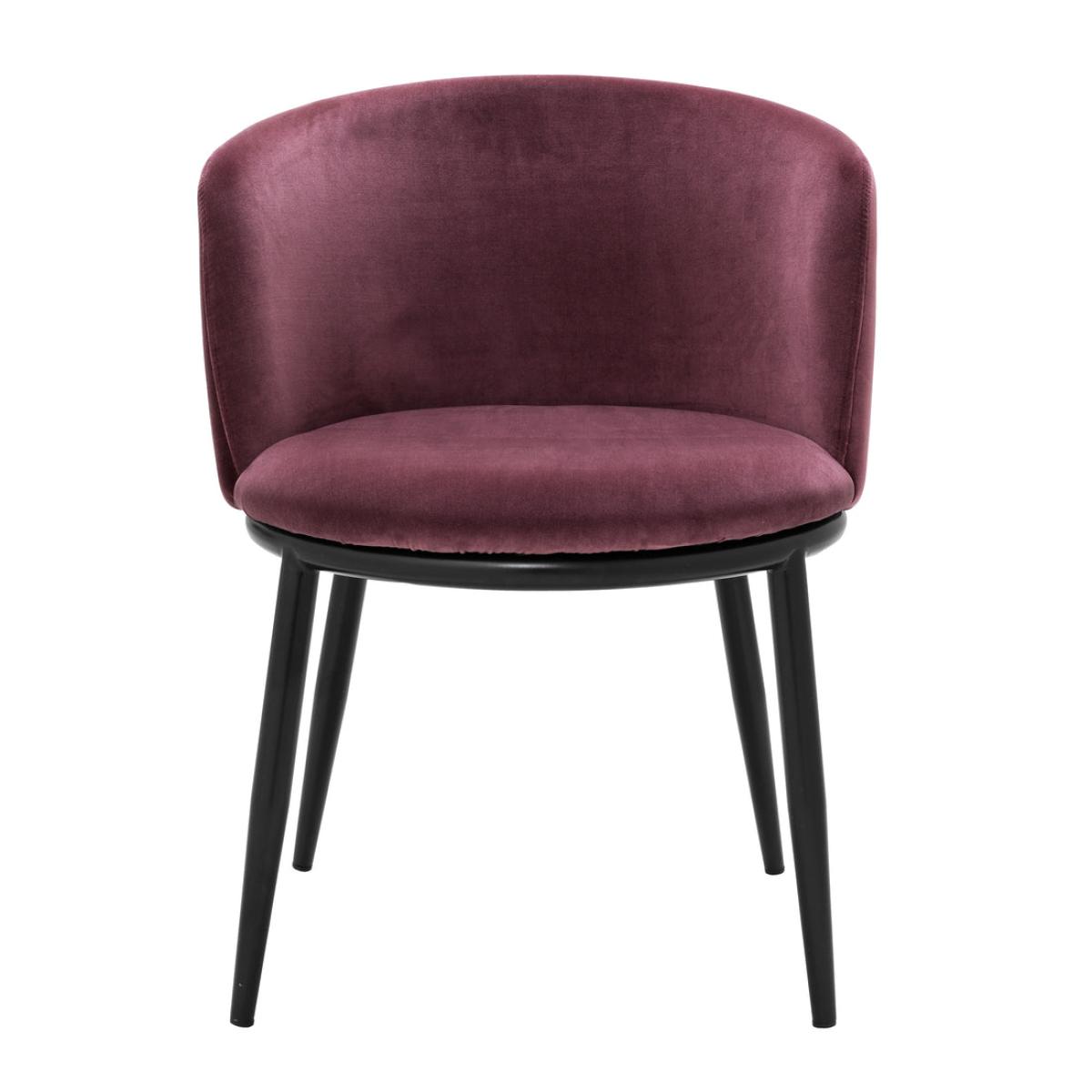 Add vintage charm to your dining room or kitchen with this attractive set of 2 Filmore Dining Chairs. The black frames with tapered legs feature a round seat with a bent backrest in Cameron royal. View More. Add vintage charm to your dining room or kitchen with this attractive set of 2 Filmore Dining Chairs. The black frames with tapered legs feature a round seat with a bent backrest in Cameron royal purple upholstery. Downloads:. Item specification sheet. Assembly instruction. Finish: Cameron purple | black legs.