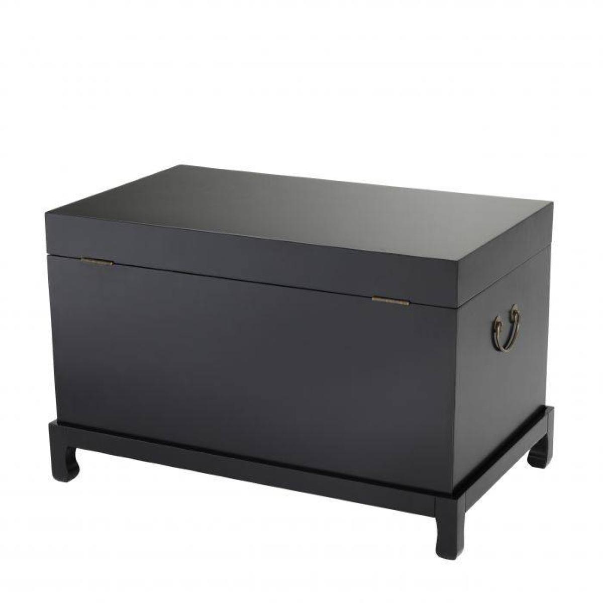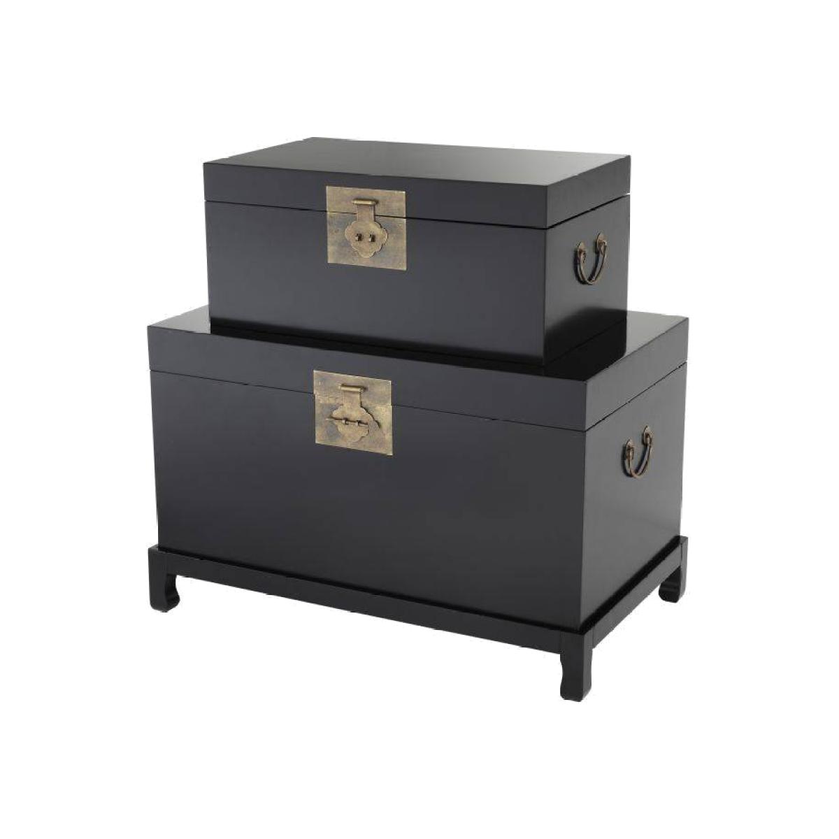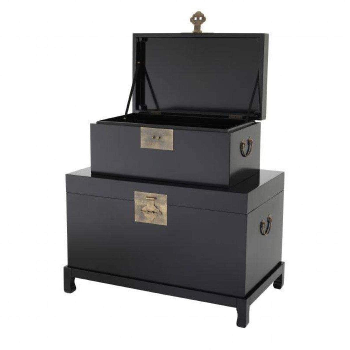 Marvellous looks and practical storage make this set of 2 Kani Chests a must-have piece. Because of their simple design these black Chinese trunks will blend in with every interior scheme. Both trunks feature antiqued brass clasps and carrying handles. Downloads: Item specification sheet Dimensions: 82 x 48 x H. 52 cm | 63 x 37 x H. 28 cm. Weight: 28kg Black finish | antique brass hardware