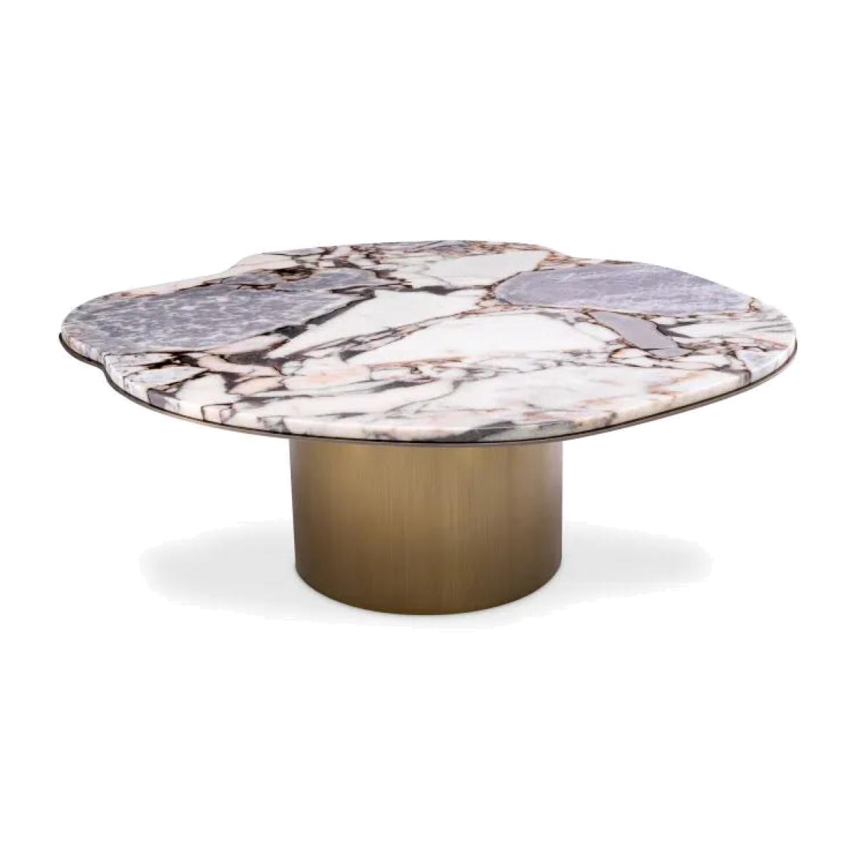 Indulge in the opulent allure of the Shapiro Coffee Table. This masterpiece boasts a marble top that exudes elegance and natural beauty. The smooth and lustrous surface of the marble is complemented by the brushed brass finish of the base, creating a harmonious blend of luxury and sophistication. Whether it's a centerpiece for your living room or a statement piece in your elegant space, the Shapiro Coffee Table will captivate with its exquisite design. Dimensions: L. 99 | W. 87.5 | H. 37 cm Materials: Brushed brass finish | marble top. Marble is a natural material, each piece differs in color and veining Care Instructions:Wipe clean with a damp cloth, don't use harsh cleaners, etc